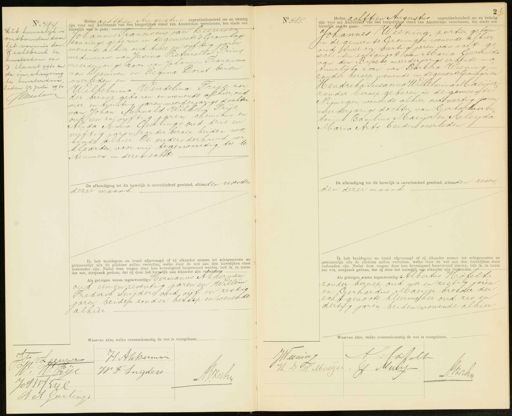 No. 484 N. 184 Dit huwelijk is itbonden door et vonring der Rechtbank te msterdam van Maart 1910 en de inschrijving Amsterdam, idem 23 Juli 1910. Jmaalen Heden achttien Augustus negentienhonderd zes en twintig zijn voor mij Ambtenaar van den burgerlijken stand van Amsterdam verschenen, ten einde een huwelijk aan te gaan: - Johannes Franciscus van Leeuwen cancierge, geboren in de gemeente 's Gravenhage wonende alhier oud twee en vyftig jaren. weduwnaar van Josina Pieternella Prins meerderjarige zoon van Johannes Franciscus van Leeuwen en Regina Dorst beiden overleden en Wilhelmina Wendelina Prije zon der beroep geboren en wonende alhier, oud vier en twintig jaren meerdervarige dochter van Johan Arnold Wilherm Pryl, oud een en vyftig jaren chemicus en Alida Arna Geerlings oud drie en vijftig jaren zonder beroep beiden wo¬ nende alhier. De ouders derbruid ver klaarden, voor mij tegenwoordig, toe te stemmen in dezen echt De afkondiging tot dit huwelijk is onverhinderd geschied, alhierden zevenden dezer maand Ik heb bruidegom en bruid afgevraagd of zij elkander nemen tot echtgenooten en getrouwelijk alle de plichten zullen vervullen, welke door de wet aan den huwelijken staat verbonden zijn. Nadat deze vragen door hen bevestigend beantwoord werden, heb ik, in naam der wet, uitspraak gedaan, dat zij door het huwelijk aan elkander zijn verbonden Als getuigen waren tegenwoordig: ermanus Akkerman oud een en zeventig jaren en Willem Frederik snijders oud vijf en zestig jaren beiden zonder beroep en wonende alhier Waarvan akte, welke overeenkomstig de wet is voorgelezen. No 485 ntig Aerentante gan. en Augustus Heden 1 zijn voor mij Ambtenaar van den burgerlijken stand van Amsterdam verschenen, ten einde eer Johannes eening, portien geboren n de gemeente Groningen, wonende alhier oud twee en veertig jaren, van echt ge„ scheiden echtgenoot van Maria Geertruida van den Broeke meerderjarige erkende na tuurlijke zoon van Barbera Weening, zonder beroep wonende in degemaente Groningen en Hendrika Susanna Wilhelmina Maeijer, zonder beroep geboren in de gemeente Nijmegen, wonende alhier, oud veertig jaren meerderjarige dochter van Gerhardus An tons Baulius Maeyjer en Aleyda Maria Arts beiden overleden. De afkondiging tot dit huwelijk is onverhinderd geschied, alhierden zeven den dezer maand Ik heb bruidegom en bruid afgevraagd of zij elkander nemen tot echtgenooten en getrouwelijk alle de plichten zullen vervullen, welke door de wet aan den huwelijken staat verbonden zijn. Nadat deze vragen door hen bevestigend beantwoord werden, heb ik, in naam der wet, uitspraak gedaan, dat zij door het huwelijk aan elkander zijn verbonden. Als getuigen waren tegenwoordig: Albertus Rofelf zonder beroep, oud vier en zestig jaren en Gerhardus Maeyjer broeder der echtgenoote kleermaker oud zes en dertig jaren, beiden wonende alhier. Waarvan akte, welke overeenkomstig de wet is voorgelezen. H Akterman JLeeume Jv J W. W. Pye W F Snijders Avzahy JHWJTyl A A Geerlingi f tafelt JWeening H L W Moeger J Meies Bzahy