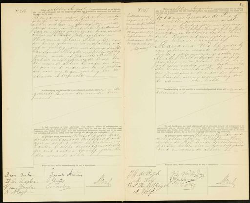 No 486. Heden achttien Augustus negentienhonderd zes en twintig zijn voor mij Ambtenaar van den burgerlijken stand van Amsterdam verschenen, ten einde ee huwelijk aan te gaan Tenjamin van Kanten, venteg geboren in de gemeenteGroningen wonende alhier oud vier en twintig jaren, meerder jarige zoon van Victor van Zanten oud twee en vijftig jaren zonder beroep, wonende alhier en Naatje Cohen overleden en Hermina Clara Slagter, zon der beroep geboren en wonende alhier, oud vijf en twintig jaren meerderjarige dochter van Samuel Slagter oud zes en vijftig jaren, venter en Jeannette Aronius oud vier en vyftigjaren zonder beroep, bei den wonende alhier. De vader des brui de goms en de ouders der bruid verklaar„ den, voor mij tegenwoordig toe te stemmen in dezen echt De afkondiging tot dit huwelijk is onverhinderd geschied, alhier en in de gemeente Bussum den zevenden dezer maand Ik heb bruidegom en bruid afgevraagd of zij elkander nemen tot echtgenooten en getrouwelijk alle de plichten zullen vervullen, welke door de wet aan den huwelijken staat verbonden zijn. Nadat deze vragen door hen bevestigend beantwoord werden, heb ik, in naam der wet, uitspraak gedaan, dat zij door het huwelijk aan elkander zijn verbonden.— Als getuigen waren tegenwoordig: Wolf Slagter broe¬ der der echtgenoote buffetchep, oud drie en dertig jaren en Salomon van anten broeder des echtgenootssla ger oud acht en twintig jaren, bei¬ den wonende alhier. No. 487 Echtscheiding uitgesproken bij vonnis der Rechtbank A Amsterdam van 22 augustus 1957, ingeschreven te msterdam, heden 26 September 1953 Hudevillem Heden achttien Augustus derd zes en twintig zijn voor mij Ambtenaar van den burgerlijken stand van Amsterdam verschenen, ten einde een huwelijk aan te gaan: Johannes Gerardus de Ry huisschilder, geboren en wonende alhier oud een en twintig jaren, meerderjarige zoon van Wilhelmus Hendrikus de Rijk, overleden en Catharina Sophia Hen drika Keyser, oud zesen veertig jaren, zonder beroep, wonende alhier en Marianna Wolfzonder be roep geboren en wonende alhier oud twintig jaren, minderjarige dochter van Abraham Wolf, oud negen en veertig jaren koopman en Johanna Werkendam, oud zes en veertig jaren costrumnaar ster beiden wonende alhier. De moeder des bruidegoms en de ouders der bruid verklaarden, voor mij tegenwoordig toe te stemmen in dezen echt. De afkondiging tot dit huwelijk is onverhinderd geschied, alhier den zevenden dezer maand Ik heb bruidegom en bruid afgevraagd of zij elkander nemen tot echtgenooten en getrouwelijk alle de plichten zullen vervullen, welke door de wet aan den huwelijken staat verbonden zijn. Nadat deze vragen door hen bevestigend beantwoord werden, heb ik, in naam der wet, uitspraak gedaan, dat zij door het huwelijk aan elkander zijn verbonden Als getuigen waren tegenwoordig Johannes Guldemond metaalbewerker en Wilhelmus Hen drikus de Rijk, broeder des echtgenoot portier, beiden vier en twintig jaren oud en wonende alhier. Waarvan akte, welke overeenkomstig de wet is voorgelezen. B van Janten Jeancte Auanm D: Sagter H. C. Hagter. Azahg S v Lonten V: vanDanten A: Mayk Jald Warker J G. de Rijk J Guldenen K Wolf Azahy C.S. H de Reysen W.K de Tij A: Wolf