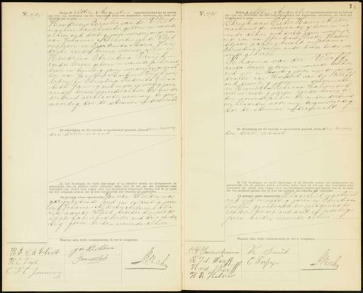No. 494 Heden achttien Augustus negentienhonderd zes en twintig huwelijk aan te gaan: zijn voor mij Ambtenaar van den burgerlijken stand van Amsterdam verschenen, ten einde een Hendricus Cornelis van de Vliet machine-houtbewerker, geboren en wonende alhier oud dertig jaren meerderjarige zoon van Johannes Albertus van de Vliet overleden en Geertruida Maria Hen drias zonder beroep, wonende alhier en Hendrina Christina Suijk zonder beroep, geboren en wonende alhier, oud twee en twintig jaren meerderjarige doch ter van Jacobus Martinus Vuijk over leden en Christina Frederika Elisa, beth Janning, oud negen en veertig jaren, zonder beroep wonende alhier. De moeder derbrnd verklaarde voor mij tegen„ woordig, toe te stemmen in dezen echt. De afkondiging tot dit huwelijk is onverhinderd geschied, alhier den hevere den dezer maand Ik heb bruidegom en bruid afgevraagd of zij elkander nemen tot echtgenooten en getrouwelijk alle de plichten zullen vervullen, welke door de wet aan den huwelijken staat verbonden zijn. Nadat deze vragen door hen bevestigend beantwoord werden, heb ik, in naam der wet, uitspraak gedaan, dat zij door het huwelijk aan elkander, zijn verbonden. Als getuigen waren tegenwoordig: Jan van Veelden ma¬ gazijnbediende oud een en zestig jaren en Johannes Albertus Antonius Ma„ rias van de Vliet broeder des echtge„ noots fabrieks arbeider oud drie en der„ tig jaren, beiden wonende alhier. No. 495 istug h huwelijk aan te gaan:— zijn voor mrij embtenaar van den burgerlijken stand van Amsterdam verdehonen, ten elnde ee hristiaan Pieter Havenstroom machinist ter koopvaardij geboren en wo„ nende alhier, oud dertig jaren, meerderja rige zoon van Christiaan Pieter Haven stroom pakkingknecht en Johanna Christina Tosjijn, zonder beroep, beiden wo¬ nende alhier en Klasina van der Wer„ zonder beroep, geboren en wonende alhier oud vier en twintig jaren, meerderjarige dochter van Hendrik van der Werff oudzeventig jaren schoenmaker en Henrietta Rebecca Halvers oud vier en zestig jaren zonder beroep, bei den wonende alhier. De ouders der bruid verklaarden, voor mij tegenwoordig, toe te stemmen in dezen echt De afkondiging tot dit huwelijk is onverhinderd geschied, alhier den zeven den dezer maand. Ik heb bruidegom en bruid afgevraagd of zij elkander nemen tot echtgenooten en getrouwelijk alle de plichten zullen vervullen, welke door de wet aan den huwelijken staat verbonden zijn. Nadat deze vragen door hen bevestigend beantwoord werden, heb ik, in naam der wet, uitspraak gedaan, dat zij door het huwelijk aan elkander zijn verbonden. als getuigen woren tegenwoordig: Olaas Smit machiniss oud vijf en vijftig jaren en Christiaan Sosjijn, grootvader des echtgenoots zonder beroep oud acht en zeventig jaren, beiden wonende alhier. J M ullen HE V.d. Vliet. Co Javande Whet AvZakg HC Vuijk