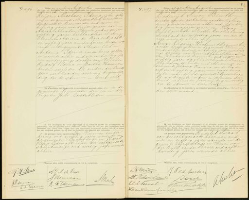 No. 496. Heden negentien Augustus negentienhonderd zes en twintig zijn voor mij Ambtenaar van den burgerlijken stand van Amsterdam verschenen, ten einde een huwelijk aan te gaan. Reyerus Nicolaas Idema ijker, geboren in de gemeente Medemblik, wonende in de gemeente Leeuwarden oud zeven en twintig jaren meerderjarige zoon van Adriaan Abraham Idema, oudnegen, en vyftig jaren boekhandelaar en Anna Oleonora Adriana de Boer oud acht en vijftig jaren zonder beroep, beiden wonende in de gemeente Medemblik en Antonia Idema zonder beroep, geboren en wonende alhier, oud vier en twintig jaren meerderjarige dochter van Wicher Rudolf Idema en Bartha Hausmann, beiden overleden. De ouders desbruide goms verklaarden, voor mij tegenwoordig, toe te stemmen in dezen echt. De afkondiging tot dithuwelijk is onverhinderd geschied, alhier en in de gemeente Leeuwarden den een en dertigsten Juli laatstleden. Ik heb bruidegom en bruid afgevraagd of zij elkander nemen tot echtgenooten en getrouwelijk alle de plichten zullen vervullen, welke door de wet aan den huwelijken staat verbonden zijn. Nadat deze vragen door hen bevestigend beantwoord werden, heb ik, in naam der wet, uitspraak gedaan, dat zij door het huwelijk aan elkander zijn verbonden. als getuigen waren tegenwoordig Jan Heenman zonder alhoep oud zeventig jaren wonende in de gemeente ’s Gravenhage en Barel Hero Idemabroeder der echtgenoote, Scheikundige, oud veertig jaren wonende alhier. Waarvan akte, welke overeenkomstig de wet is voorgelezen. No. 497. Heden negentien Augustus negentienhonderd zes en twintig zijn voor mij Ambtenaar van den burgerlijken stand van Amsterdam verschenen, ten einde een huwelijk aan te gaan. Lodewijk Simon Reuth. directeur van een particulieren nachtveiligheid dienst, geboren en wonende alhier, oud vijf en twin tig jaren, meerderjarige zoon van Ssaag Beuth overleden en Esther Carolina Lomsa Swaal, oud zes en zestig jaren, zonder be roep, wonende alhier en Anne Olga van Wichevoort Crommelin zonder beroep geboren in de gemeente Velsen, vej nende alhier, oud vier en twintig jaren meerderja rige dochter van Henrick Samuel Maxumiliaar van Wickevoort Crommelin, oud negen en vijftig jaren, dagbladschrijver en Franciun Johanka van der Linden zich ooknoemende en schrijvende Johanna Francina van der Kinden oud een en vijftig jaren zonder beroep beiden wonende in de gemeente 's Gravenhoge De moeder desbrinde goms en de ouders der bruid verklaarden, voor mij tegenwoordig toe te stemmen in dezen echt De afkondiging tot dit huwelijk is onverhinderd geschied, alhier den zeven den dezer maand Ik heb bruidegom en bruid afgevraagd of zij elkander nemen tot echtgenooten en getrouwelijk alle de plichten zullen vervullen, welke door de wet aan den huwelijken staat verbonden zijn. Nadat deze vragen door hen bevestigend beantwoord werden, heb ik, in naam der wet, uitspraak gedaan, dat zij door het huwelijk aan elkander zijn verbonden. als getuigen waren tegenwoordig: Ridolph Swaal oom des echtgenoots, koopman oud vier en zestig jaren wonende in de gemeente 's Gravenhage en Henri van der Bijll, zonder beroep, oud acht en twintig jaren, wonende alhier. Waarvan akte, welke overeenkomstig de wet is. P.H: Sdema A.E. A. de Boer J Veenman Azahy Adema K. H Edema A. A. Icenra C Blun J.F. v.d Lutder DD WVickevoort Crommel Dwaale EC. L. Siaab Hjenritande Vijk HW van Woekevoorthonmeli