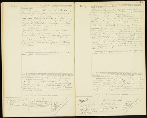No. 418 Heden eenentwintig Juli - negentienhonderd zeven en twintig zijn voor mij Ambtenaar van den burgerlijken stand van Amsterdam verschenen, ten einde een huwelijk aan te gaan Gerhardus Hendrik Bakker; kantoorbediende, geboren en wonende al- hier, oud vierenveertig jaren, weduw- naar van Elisabeth Alida Roopman. meerderjarige zoon van Gerhardus Hendrik Bakker, overleden en Clara Sibilla Dikken, zonder beroep, wo„ nende alhier en Gesina van El zonder beroep,- geboren in de gemeente Arnhem, wo- nende alhier, oud zesendertig jaren meerderjarige dochter van Dirk- van El, zonder beroep, wonende in de gemeente Velsen en Gesma Lavoo, overleden De afkondiging tot dit huwelijk is onverhinderd geschied, alhier den negen- den Juli laatstleden Ik heb bruidegom en bruid afgevraagd of zij elkander nemen tot echtgenooten en ge trouwelijk alle de plichten zullen vervullen, welke door de wet aan den huwelijken staat ver bonden zijn. Nadat deze vragen door hen bevestigend beantwoord werden, heb ik, in naam der wet, uitspraak gedaan, dat zij door het huwelijk aan elkander zijn verbonden Als getuigen waren tegenwoordig: Arnold Cornelis Koopman, schoonvader des echtge noots, antiguair oud drie en zeventig jaren, en Hendrik Klinkenberg, kan toorbediende, oud veertig jaren, beiden wonende alhier Waarvan akte, welke overeenkomstig de wet is voorgelezen No. 419 15 Heden eenentwintig JJuli negentienhonderd zeven en twintig zijn voor mij Ambtenaar van den burgerlijken stand van Amsterdam verschenen, ten einde een huwelijk aan te gaan: Dirk Moraal, agent van politie geboren in de gemeente Boskoop, wonende alher, oud negenentwintig jaren meer derjarige zoon van Thijs Moraal, oud vijftig jaren, tuinman, wonende al hier en Martyntje Taling, overleden en Bertha Wilhelmina de Vries, zonder beroep, geboren en wonende al hier, oud zesentwintig jaren, meerder jarige dochter van Bernardus Gerar dus de Vries, oud twee en zestig jaren. timmerman en Anna Johanna Elizabeth Neehus, oud zestig jaren zonder beroep, beiden wonende alhier. De vader des bruidegous en de ouders der bruid verklaarden, voor mij tegenwoordig, toe te stemmen in zeren echt De afkondiging tot dit huwelijk is onverhinderd geschied, alhier den negenden Juli laatstleden Ik heb bruidegom en bruid afgevraagd of zij elkander nemen tot echtgenooten en ge trouwelijk alle de plichten zullen vervullen, welke door de wet aan den huwelijken staat ver- bonden zijn. Nadat deze vragen door hen bevestigend beantwoord werden, heb ik, in naam der wet, uitspraak gedaan, dat zij door het huwelijk aan elkander zijn verbonden. Als getuigen waren tegenwoordig: Johannes Alexander de Vries, oom der echtgenoote, metaal draauer, oud vyfenzestig jaren, en 1 Wilko Johan de Vries broeder der echtgenoote, kantoorbediende oud zevenentwintig Jaren, beiden wonende alhier Waarvan akte, welke overeenkomstig de wet is voorgelezen. Jorde A C Koopman G van El HKenchenturg Joe Jo AJ E de Vries-Neche