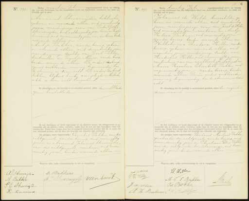 391 Heden veertien Juli negentienhonderd zeven en twintig zijn voor mij Ambtenaar van den burgerlijken stand van Amsterdam verschenen, ten einde een huwelijk aan te gaan: Aarnoud Stroosnijder, ketelmaker, geboren en wonende alhier, oud vierentwintig jaren, meerderjarige zoon van Pieter Gilles stroosnijder, oud achtenveertig jaren, heier en Bigtje sinnema, oud zevenenveertig jaren, zonder beroep, beiden wonende alhier en Antje Bakker, zonder beroep, geboren en wonende alhier, oud drieentwintig jaren, E PO meerderjarige dochter van Joost akker, bootwerker en Trijntje Meijer, zonder beroep beiden wonende alhier. De ouders desbruide goms verklaarden, voor mij tegenwoordig, toe te stemmen in dezen echt. De ouders der bruid hebben, blijkens hierbij overgelegde authentieke akte, in dezen echt toegestemd. De afkondiging tot dit huwelijk is onverhinderd geschied, alhier den achttienden Juni laatstleden. Ik heb bruidegom en bruid afgevraagd of zij elkander nemen tot echtgenooten en getrouwelijk alle de plichten zullen vervullen, welke door de wet aan den huwelijken staat ver bonden zijn. Nadat deze vragen door hen bevestigend beantwoord werden, heb ik, in naam der wet, uitspraak gedaan, dat zij door het huwelijk aan elkander zijn verbonden Als getuigen waren tegenwoordig: Cornelis Bakker, oom der echtgenoote, zonder beroep oud zesenvijftig jaren en Aarnoud Johannes Stroosnijder, oud zesen oom des echtgenoots, werkman veertig jaren, beiden wonende alhier. 11. 392 Heden twintig Juli negentienhonderd zeven en twintig zijn voor mij Ambtenaar van den burgerlijken stand van Amsterdam verschenen, ten einde een huwelijk aan te gaan: Johannes de Wilde, huisschilder, ge boren en wonende alhier, oud eenentwintig jaren meerderjarige zoon van Jacob de Wilde oud eenenzestig jaren, - werkman en Aartje 8 Helena Beekman, oud eenenzestig jaren, zonder beroep, beiden wonende alhier en Wilhelmina Theodora Hiller, zonder beroep, geboren en wonende alhier, oud negentien jaren, minderjarige dochter van Hendrikus Hiller, oud negenenvijftig jaren controleur aan een nachtveiligheidsdienst en Maria Rosalina Elisabeth Bakker, oud negenenveertig jaren, — zonder beroep, beiden wonende alhier. Beider ouders verklaarden; voor mij tegenwoordig, toe te stemmen in dezen echt.De afkondiging tot dit huwelijk is onverhinderd geschied, alhier den negenden dezer maand. Ik heb bruidegom en bruid afgevraagd of zij elkander nemen tot echtgenooten en getrouwelijk alle de plichten zullen vervullen, welke door de wet aan den huwelijken staat ver bonden zijn. Nadat deze vragen door hen bevestigend beantwoord werden, heb ik, in naam der wet, uitspraak gedaan, dat zij door het huwelijk aan elkander zijn verbonden. Als getuigen waren tegenwoordig: Theodorus Martinus Bakker grootvader der echtgenoote, zonder beroep, oud vierenzeventig jaren en Christiaan Petrus Bakker, oom der echtgenoote, handelsreiziger, oud tweeen veertig jaren, beiden wonende alhier. Waarvan akte, welke overeenkomstig de wet is voorgelezen. E Bakker A. Stroosnijd FJ Thoomijde van Soest, A Bakker. PD G. Stroosyk R. Ginnema. H. Hillen adk De Wilde W.Th: Hille M r E. Bakker AZahen In Bakker J de Weeu I.C A H Beekman Bakker 1