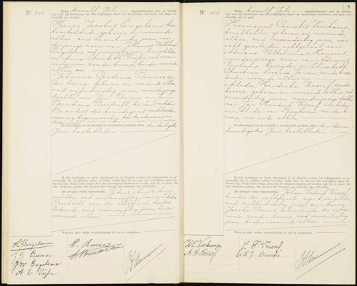 No. 403. Heden twaalf Juli negentienhonderd acht en twintig huwelijk aan te gaan: zijn voor mij Ambtenaar van den burgerlijken stand van Amsterdam verschenen, ten einde een 9 Henri Jacobus Engelsma kan toorbediende, geboren en wonende alhier oud drieentwintig jaren meer- derjarige zoon van Johannes Wilhelmas ongelsma oud vierenzestig jaren, huisschilder en Anna Elisabeth Visser oud vieren zestig jaren, zonder beroep, beiden wonende alhier en Johanna Gerdina Beumer zon der beroep, geboren en wonende alhier oud vijfentwintig jaren meerderjarige dochter van Jan Beumer en Janna Berndiena Breetvelt beiden overleden De ouders des bruidegoms verklaarden voor mij tegenwoordig, toe te stemmen in dezen echt De afkondiging tot dit huwelijk is onverhinderd geschied, alhier den dertigsten Juni laatstleden Ik heb bruidegom en bruid afgevraagd of zij elkander nemen tot echtgenooten en ge trouwelijk alle de plichten zullen vervullen, welke door de wet aan den huwelijken staat ver- bonden zijn. Nadat deze vragen door hen bevestigend beantwoord werden, heb ik, in naam der wet, uitspraak gedaan, dat zij door het huwelijk aan elkander zijn verbonden. Als getuigen waren tegenwoordig: Petrus Amesz, huis schilder, oud achtenvijftig jaren en Lubertus Breetvelt, oom der echtgenoote kantoor bediende, oud vierenvijftig jaren, beiden wonende alhier. Waarvan overeenkomstig de wet is voorgelezen. No. 404. Heden twaalf Juli negentienhonderd acht en twintig zijn voor mij Ambtenaar van den burgerlijken stand van Amsterdam verschenen, ten einde eer huwelijk aan te gaan: