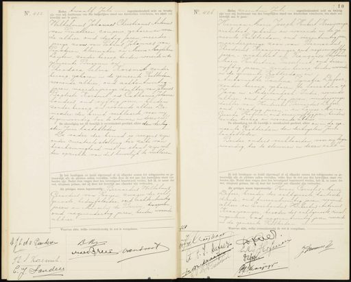 No. 405 Heden twaalf Juli negentienhonderd acht en twintig zijn voor mij Ambtenaar van den burgerlijken stand van Amsterdam verschenen, ten einde een huwelijk aan te gaan: Wilhelmus Johannes Christianus Antonius van Pinxteren coupeur, geboren en wonen de alhier, oud dertig jaren meerder jarige zoon van Petrus Johannes van Tinxteren, kleermaker en Maria Magdalena Leijten, zonder beroep, beiden wonende in de gemeente Bussum en Theodora selma Korsmit zonder beroep, geboren in de gemeente Rotterdam wonende alhier oud achtentwintig jaren, meerderjarige dochter van Johannes Paptiste Korsmit en Catharina Johanna sanders oud vijftig jaren, — beiden zonder beroep en wonende alhier. De moeder der bruid verklaarde voor mij tegenwoordig, toe te stemmen in dezen echt De afkondiging tot dit huwelijk is onverhinderd geschied, alhier den dertig sten Juni laatstleden De vader der bruid is wegens zijn onder curateelestelling ter zake van krankzinnigheid niet in staat zijn wil ten opzichte van dit huwelijk te verklaren Ik heb bruidegom en bruid afgevraagd of zij elkander nemen tot echtgenooten en ge trouwelijk alle de plichten zullen vervullen, welke door de wet aan den huwelijken staat verbonden zijn. Nadat deze vragen door hen bevestigend beantwoord werden, heb ik, in naam der wet, uitspraak gedaan, dat zij door het huwelijk aan elkander zijn verbonden. Als getuigen waren tegenwoordig: Bernardus Wilhelmus Gerardus van Royen, zwager der echtgenoote bedrijfslerder, oud achtentwintig jaren en Marcelis de Bruin, koopman oud negenendertig jaren, beiden wonende alhier. Waarvan akte, welke overeenkomstig de wet is voorgelezen. No. 406. Heden zeventien Juli negentienhonderd acht en twintig zijn voor mij Ambtenaar van den burgerlijken stand van Amsterdam verschenen, ten einde een huwelijk aan te gaan: Herman Marie Joseph Hubert Kraayvange architect geboren en wonende in de ge meente Rotterdam, oud vierentwintig jaren meerderjarige zoon van Bernardus Theodorus Kraayvanger oud negenenvijftig jaren, - architect en Francoise Stephanie Marie Hubertine Tiesselinck, oud drieen vijftig jaren, zonder beroep, beiden wonende in de gemeente Rotterdam en Antoinette Paulina Ignatia Defoer zonder beroep, geboren te soerabara op Java in Nederlandsch- Indië wonende alhier, oud twintig jaren, minderjarige dochter van Hendricus Bernardus Defoer, oud zestig jaren, — en Louise Maria Gerarda Hofman oud eenenvijftig jaren; beiden zonder beroep en wonende alhier. De afkondiging tot dit huwelijk is onverhinderd geschied, alhier en in de ge meente Rotterdam den dertigsten Juni laatstleden Beider ouders verklaarden, voor mij tegen woordig, toe te stemmen in dezen echt. Ik heb bruidegom en bruid afgevraagd of zij elkander nemen tot echtgenooten en ge trouwelijk alle de plichten zullen vervullen, welke door de wet aan den huwelijken staat ver bonden zijn. Nadat deze vragen door hen bevestigend beantwoord werden, heb ik, in naam de wet, uitspraak gedaan, dat zij door het huwelijk aan elkander zijn verbonden Als getuigen waren tegenwoordig: Henri Cornelis Marie Defoer, broeder der echtgenoote kantoorbe diende, oud tweeentwintig jaren, wonende alhier en Everhardus Hubertus Antonius Araayvanger broeder des echtgenoots, civiel ingenieur oud negenentwintig jaren, wonende in de gemeente Rotterdam. Waarvan akte, welke overeenkomstig de wet is voorgelezen. BRg W.H.C.A. v. Pimsteren vere Briee vandoest Jh. S. Korsuet. C. J. Sanders Aleigtes Ay Hssen Come J. Pehe .. JHJ A Haypr GJ