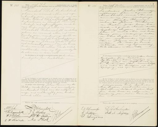 No. 385. Heden vijf Juli negentienhonderd acht en twintig zijn voor mij Ambtenaar van den burgerlijken stand van Amsterdam verschenen, ten einde een huwelijk aan te gaan: Meindert Blok kantoorbediende, geboren en wonende alhier, oud negen- entwintig jaren meerderjarige zoon van Willem Frederik Blok oud drieenvijftig jaren kantoorlooper en Elisabeth Henriette tendorfer oud vijfenvijftig jaren, zonder be- roep, beiden wonende alhier en Elisabeth Verbaarschott zonder bereg geboren en wonende alhier oud vieren twintig jaren, meerderjarige Lochter van Pieter Verbaarschott oud zestig jaren, concierge en Johanna Grada Strijkers oud eenenzestig jaren, — zonder beroep beiden wonende alhier. Beider ouders verklaarden, voor mij tegenwoordig toe te stemmen in dezen echt De afkondiging tot dit huwelijk is onverhinderd geschied, alhier den drieen- twintigsten Juni laatstleden Ik heb bruidegom en bruid afgevraagd of zij elkander nemen tot echtgenooten en ge- trouwelijk alle de plichten zullen vervullen, welke door de wet aan den huwelijken staat ver- bonden zijn. Nadat deze vragen door hen bevestigend beantwoord werden, heb ik, in naam der wet, uitspraak gedaan, dat zij door het huwelijk aan elkander zijn verbonden Als getuigen waren tegenwoordig: Johan Herman van der Velden, zonder beroep, oud eenenzestig jaren en Meindert Blok, oom des echtgenoots weger oud achtenvijftig jaren, beiden wonende alhier. Weawanalig, wele operentenatig. No. 386 Heden vijf Juli oe honderd acht en twintig zijn voor mij Ambtenaar van den burgerlijken stand van Amsterdam verschenen, ten einde een huwelijk aan te gaan Lambertus Jacobus Blommestijn, welkbezorger, geboren in de gemeente Nieuwer Amstel, wonende alhier, oud zevenentwintig jaren, meerderjarige zoon van Hendrikus Blommestijn, werkman en Johanna Wilhelmina van Kasteren, zonder beroep, beiden wonende in de gemeente Nieuwer-Amstelen Gijsbertje Snijders, zonder beroep, geboren en wonende alhier, oud tweeën twintig jaren, meerderjarige dochter van Arie Snijders, oud achten veer tig jaren, waschverzender, wonende. alhier en Johanna van de Ruit overleden. De vader der bruid verklaarde, voor mij tegenwoordig toete stemmen in dezen echt De afkondiging tot dit huwelijk is onverhinderd geschied, alhierden drieen twintigsten Juni laatstleden Bij deze akte is tevens overgelegd een procex. verbaal van tusschenkomst van den kantonrechter alhier, waaruit blijkt, dat de ouders zes bruidegoms op de oproeping riet zijn verschenen. Ik heb bruidegom en bruid afgevraagd of zij elkander nemen tot echtgenooten en ge trouwelijk alle de plichten zullen vervullen, welke door de wet aan den huwelijken staat ver bonden zijn. Nadat deze vragen door hen bevestigend beantwoord werden, heb ik, in naam der wet, uitspraak gedaan, dat zij door het huwelijk aan elkander zijn verbonden Als getuigen waren tegenwoordig: Dirk Gijsbertus Arie Snijders, waschverzender en Abel Marinus Aaldert Snijders, chanf- feur, beiden broeder der echtgenoote„ zesentwintig jaren oud en wonende al hier Waarvan akte, welke overeenkomstig de wet is voorgelezen. P. Verbaarschot ABak EVerbaarschott J G Sliihers JCoo WF Blol J H Eel Velder E H Vendorfer. M. Blok JJ. Blommertjn D: G. A. Sniders C G: Snijder AM. A Arijderg C. Dnyders
