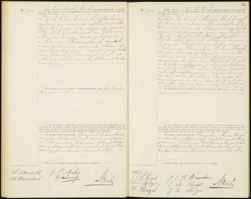 No. 721. Heden tweeentwintig November negentienhonderd acht en twintig zijn voor mij Ambtenaar van den burgerlijken stand van Amsterdam verschenen, ten einde een huwelijk aan te gaan Dirk Oostervink afteekenaar geboren en wonende alhier, oud achten- twintig jaren, meerderjarige zoon van Hendrik Oostervink en Johanna Maria Lampe beiden overleden en Maria Heemskerk zonder be- roep, geboren en wonende alhier, oud zesentwintig jaren, meerderjarige dochter van Johannes Heemskerk en Anna Maria Antonia Matthesuus, beiden overleden. De afkondiging tot dit huwelijk is onverhinderd geschied, alhier den tienden dezer maand Ik heb bruidegom en bruid afgevraagd of zij elkander nemen tot echtgenooten en ge- trouwelijk alle de plichten zullen vervullen, welke door de wet aan den huwelijken staat ver- bonden zijn. Nadat deze vragen door hen bevestigend beantwoord werden, heb ik, in naam der wet, uitspraak gedaan, dat zij door het huwelijk aan elkander zijn verbonden. Als getuigen waren tegenwoordig: Jacobus Pieter Mohrt magazijnbediende oud zevenenveertig jaren en Bernardus Johannes Schoofs zwager des echtgenoots haren controleur oud zesen dertig jaren, beiden wonende alhier. Waarvan akte, welke overeenkomstig de wet is voorgelezen. No. 722. 6 Heden tweeentwintig November negentienhonderd acht en twintig zijn voor mij Ambtenaar van den burgerlijken stand van Amsterdam verschenen, ten einde een huwelijk aan te gaan: Eltjo Frederik Meijer klerk ter grij fie eener arrondissements- rechtbank, ge boren en wonende alhier, oud zesentwintig jaren meerderjarige zoon van Rijke Roelf Meijer oud achtenvijftig jaren, kleermaker, wonende alhier en Venna Susanna Wijdieks, overleden en Johanna Cornelia Helena Heijst zonder beroep, geboren en wonende alhier, oud vierentwintig jaren meer derjarige dochter van Hendrik Heyst oud vierenvyftig jaren, — diamantslyper en Johanna Cornelia Helena Bruscker oud vijfenvijftig jaren, — zonder beroep beiden wonende alhier. De vader des bruidegoms en de ouders der bruid ver klaarden, voor mij tegenwoordig, toe te stemmen in dezen echt De afkondiging tot dit huwelijk is onverhinderd geschied, alhier den tienden dezer maand. Ik heb bruidegom en bruid afgevraagd of zij elkander nemen tot echtgenooten en ge trouwelijk alle de plichten zullen vervullen, welke door de wet aan den huwelijken staat ver- bonden zijn. Nadat deze vragen door hen bevestigend beantwoord werden, heb ik, in naam der wet, uitspraak gedaan, dat zij door het huwelijk aan elkander zijn verbonden. Als getuigen waren tegenwoordig: Cornelia Maria Heijst zuster der echtgenoote oud tweeendertig jaren en Johanna Roelfina Meijer, zuster des echtgenoots, oud drieendertig jaren beiden zonder beroep en wonende alhier Waarvan akte, welke overeenkomstig de wet is voorgelezen. J. 4 x„ Mohert S. Oostervenk B Schoofs M Heevarlerl Aozahy Geder H Bruscker J. C. H. Heyst. Bolv Megen zahy C. M: Heyst A H Heust: R Meeie
