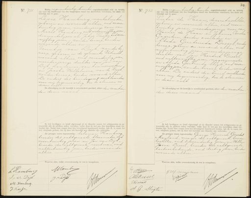 No. 731. Heden negenentwintig November - negentienhonderd acht en twintig zijn voor mij Ambtenaar van den burgerlijken stand van Amsterdam verschenen, ten einde een huwelijk aan te gaan: Levie Hamburg, meubelmaker geboren en wonende alhier oud zevenen twintig jaren, meerderjarige zoon van Mozes Hamburg oud vierenvijftig jaren diamantslijper en Jetje Presser oud eenen vijftig jaren, - zonder beroep, beiden wonende alhier en Teuntje van Dijk zonder be roep, geboren in de gemeente Utrecht wonende alhier oud eenendertig jaren meerderjarige dochter van Jan van Dijk aannemer van timmerwerken en Jacoba Wilhelmina van de Kraak zonder beroep beiden wonende alhier De ouders des bruidegoms verklaarden, voor mij tegenwoordig, toe te stemmen in dezen echt. De afkondiging tot dit huwelijk is onverhinderd geschied, alhier den zeventien- den dezer maand Ik heb bruidegom en bruid afgevraagd of zij elkander nemen tot echtgenooten en ge trouwelijk alle de plichten zullen vervullen, welke door de wet aan den huwelijken staat ver- bonden zijn. Nadat deze vragen door hen bevestigend beantwoord werden, heb ik, in naam der wet, uitspraak gedaan, dat zij door het huwelijk aan elkander zijn verbonden. Als getuigen waren tegenwoordig: Salomon Hamburg broeder des echtgenoots kleermaker, oud zesentwintig jaren en Jan van Dijk, broeder der echtgenoote werkman, oud achtentwintig jaren, beiden wonende alhier Waarvan akte, welke overeenkomstig de wet is voorgelezen. No. 732. Heden negenentwintig November - negentienhonderd acht en twintig zijn voor mij Ambtenaar van den burgerlijken stand van Amsterdam verschenen, ten einde een huwelijk aan te gaan: Pieter de Haan decoratieschilder geboren en wonende alhier, oud zesen twintig jaren, meerderjarige zoon van Warner de Haan en Johanna Cornelia Gagestein, beiden overleden en Alida Geertruida Dissel, zonder beroep, geboren en wonende alhier oud vijfentwintig jaren meerderjarige dochter van Jan Hendrik Dissel oud achtenvijftig jaren, magazinmeester en Alida Geertruida Sligte, oud zeven envijftig jaren, zonder beroep beiden wonende alhier. De ouders der bruid verklaarden voor mij tegenwoordig, toe te stemmen in dezen echt. De afkondiging tot dit huwelijk is onverhinderd geschied, alhier den zeventien den dezer maand. Ik heb bruidegom en bruid afgevraagd of zij elkander nemen tot echtgenooten en ge- trouwelijk alle de plichten zullen vervullen, welke door de wet aan den huwelijken staat ver- bonden zijn. Nadat deze vragen door hen bevestigend beantwoord werden, heb ik, in naam der wet, uitspraak gedaan, dat zij door het huwelijk aan elkander zijn verbonden. Als getuigen waren tegenwoordig: George Heinrich Gerardus Mayland, zwager der echtgenoote brieven besteller, oud tweeendertig jaren en Willem Josua Dissel, broeder der echtgenoote kantoorbediende, oud dertig jaren, beiden wonende alhier. Waarvan akte, welke overeenkomstig de wet is voorgelezen. Mamber L. Hamburg C J v. Wijk J: V: Dyk M. Hamburg J Prassen PdeHaan GHG Mayland