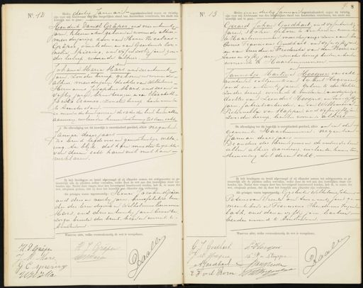 No. 12 Heden dertig Januari negentienhonderd negen en twintig zijn voor mij Ambtenaar van den burgerlijken stand van Amsterdam verschenen, ten einde een huwelijk aan te gaan: Hendrik Daniël Gräper oud vier entwintig jaren, kleermaker, geboren en wonende alhier. meerderjarige zoon van Henri Nicolaas- Graper overleden, en van Geertruise Cor„ nelis Spiering, oud vijf en zestig jaard, zon- der beeroep, wonende alhier en Johanna Maria Hars, oud zes entwintig jaren, zon der beroep, geboren en wonende- alhier, meerderjarige dochter van Wilhelmus, Hermanus Josephus Hars, oud zes en Vijftig jaren, broodbezorger, en van Elizabeth. Jacob Cramer, zonder beroep, beiden wonende te Amsterdam te maeder des brendegomsen de vader der brud, leeden alhie aanwezig, verleenden Lunne toerkmnng tot dieer echt De afkondiging tot dit huwelijk is onverhinderd geschied, alhier negentien- Januari dezes jaars De beruid legde over een genieskundige wrkla ring, ter blyjke, dat hare moeder ter opzichte- van dezen echt haren wil niet kan- verklaren. Ik heb bruidegom en bruid afgevraagd of zij elkander nemen tot echtgenooten en ge trouwelijk alle de plichten zullen vervullen, welke door de wet aan den huwelijken staat ver- bonden zijn. Nadat deze vragen door hen bevestigend beantwoord werden, heb ik, in naam der wet, uitspraak gedaan, dat zij door het huwelijk aan elkander zijn verbonden Als getuigen waren tegenwoordig: Henri Jacobus Graper oud drie en veertig jaren, huusscheldis. beve- dir des bruidegoms en Wilhelmus Hiermanus Hars, oud drie entwintig jaren, broodbe zorger broeder der bruid, beiden wonende te- Ambterdom Weswenalie, vele ovdeendoudig de net is vergeeleren. No. 13 Heden een en dertig Januari negentienhonderd negen en twintig, zijn voor mij Ambtenaar van den burgerlijken stand van Amsterdam verschenen, ten einde een huwelijk aan te gaan: Gerard Johan Goedhart, oud vijfentwintig jaren, stoker, geboren te binhemen wonende te Haarlemmermeer, meerderjarige zoon van: An„ Sonie Franciscus Goedhart, oud vijfen vijftig jann en van Eveerdina Frederika van den Born, ou twee en vijftig jaren, zonder beroep beiden, en berdut wonende te Haarlemmermeer. en Jannetje Hartina Hocque, van echt gescheeden echtgenoote van i9 bert Hogeveen, oud een entwintig jaren, geboren te den Helder zonder beroep, wonende te Amsterdam, meerderjarige dochter van Leendert Hocque a twee vijfti jarin, fabrieksarbeider, en van Willemina Pieternella van Stappen, oud vijfenvijftig Jare zonder beroep, beiden wonende alhier. De afkondiging tot dit huwelijk is onverhinderd geschied, alhier en in de Gemeente Haarlemmermer: negentien Januari dezes jaars De ondurs des bruidegoms en de ouders der bred allen alhier aanwezig, verleenden hunne toe„ stemming tot dezen echt. Ik heb bruidegom en bruid afgevraagd of zij elkander nemen tot echtgenooten en ge trouwelijk alle de plichten zullen vervullen, welke door de wet aan den huwelijken staat ver- bonden zijn. Nadat deze vragen door hen bevestigend beantwoord werden, heb ik, in naam der wet, uitspraak gedaan, dat zij door het huwelijk aan elkander zijn verbonden Als getuigen woren tegenwoordig: Gysleuter Wilhelmus Johanus Petrus van Vreede oud twee en veertig jaren ge meentebode en Francescus Heerdricus Ingen latt, oud drie en vyftig jaren, barbui= beiden wonnnde te Amterdam. Waarvan akte, welke overeenkomstig de wet is voorgelezen. 27 H. J. Graper H. d. Graper Mars J. M: Mars PO G C Spiering UHHa G.J. Goedhart. „ L: Hoegeie 8 8. JW. Hoegiie WA v Stappe 910 AoedhartInren E J: vd dorn Ingen