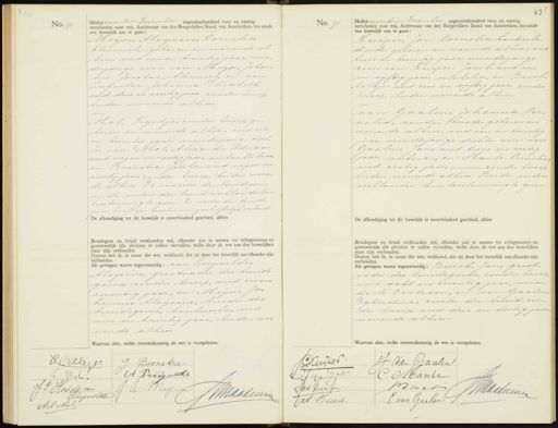 No. 90 Heden zeventien december negentienhonderd twee en veertig verschenen voor mij, Ambtenaar van den Burgerlijken Stand van Amsterdam, ten einde een huwelijk aan te gaan: Meijer, Aloysius Cornelis bloemist, geboren en wonende al¬ hier, oud een en twintig jaar, meer- derjarige zoon van: Meijer, Johan„ nes Jacobus, bloemist, en: van Puijvelde, Johanna Elisabeth. oud drie en veertig jaar, zonder beroep beiden wonende alhier. en Mol, Trijntje, zonder beroep, ge- boren en wonende alhier, oud vier en twintig jaar, meerderjarige doch- ter van: Mol, Alexander Adriaan, oud negen en veertig jaar, ambachtsbaas, en: Boonstra, jitske, oud negen en veertig jaar, zonder beroep, beiden wonen- de alhier. De moeder des bruidegoms en de ouders der bruid verklaarden hun toestemming te geven. De vader des bruide- goms heeft zijn toestemming schriftelijk verleend. De afkondiging tot dit huwelijk is onverhinderd geschied, alhier Bruidegom en bruid verklaarden mij, elkander aan te nemen tot echtgenooten en getrouwelijk alle plichten te zullen vervullen, welke door de wet aan den huwelijken staat zijn verbonden. Daarop heb ik, in naam der wet, verklaard, dat zij door het huwelijk aan elkander zijn verbonden. Als getuigen waren tegenwoordig: van Ruyvelder Aloysuis, grootvader des bruide„ goms, zonder beroep, oud zes en zeventig jaar, en: Meyer, Jo. hannes Aloysius, broeder des bruidegoms, bankwerker, oud vier en twintig jaar, beiden wo¬ nende alhier Waarvan akte, welke overeenkomstig de wet is voorgelezen. No. 91 Heden zeventien december negentienhonderd twee en veertig verschenen voor mij, Ambtenaar van den Burgerlijken Stand van Amsterdam, ten einde een huwelijk aan te gaan: Kuiper, Jan Cornelis, kantoor be- diende, geboren en wonende alhier, oud twee en twintig jaar, meerderjarige zoon van: Kuiper, Jacob, oud een en vijftig jaar, winkelier, en: Busch, Aaltje, oud een en viftig jaar, zonder beroep, beiden wonende alhier, en: van Gaalen, Johanna Cor¬ nelia, zonder beroep, geboren en wonende alhier, oud een en twintig jaar, meerderjarige dochter van van Gaalen, Jan, oud twee en zestig jaar, werkman, en: Mante, Cornelia, oud zestig jaar, zonder beroep, beiden wonende alhier. Beider ouders verklaarden hun toestemming te geven. De afkondiging tot dit huwelijk is onverhinderd geschied, alhier Bruidegom en bruid verklaarden mij, elkander aan te nemen tot echtgenooten en getrouwelijk alle plichten te zullen vervullen, welke door de wet aan den huwelijken staat zijn verbonden. Daarop heb ik, in naam der wet, verklaard, dat zij door het huwelijk aan elkander zijn verbonden. Als getuigen waren tegenwoordig: Busch, Jan, groot vader des bruidegoms, zonder beroep oud acht en zeventig jaar, wonen- de te Oostzaan, en: van Gaalen. Egberdina, zuster der bruid, zon- der beroep, oud drie en dertig jaar. wonende alhier. Waarvan akte, welke overeenkomstig de wet is voorgelezen CC Meger v/. Boonstra- is Puivede