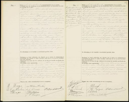 No. 11 Heden vijf en twintig November negentienhonderd twee en veertig verschenen voor mij, Ambtenaar van den Burgerlijken Stand van Amsterdam, ten einde een huwelijk aan te gaan: Haages, Hendrik, tricotwever„ geboren en wonende -alhier, oud vijf en twintig jaar, meerderjarige zoon van: Haages, Antoon, oud twee en zestig jaar fabrieksarbeider, en: van Marle, Hendrika Johanna, oud een en zestig jaar, zonder beroep, beiden wonende alhier, en: van Marlen, Dina Wilhelmina, zonder beroep geboren en wonende alhier oud acht en twintig jaars meerderjarige dochter van: van Marlen, Willem Hendrik, oud vijf en zestig jaar, en Bartels, Alida Catharina, oud negen en vijftig jaar, beiden zonder beroep en wo¬ nen de alhier. Beider ouders ver- klaarden hun toestemming te geven De afkondiging tot dit huwelijk is onverhinderd geschied, alhier Bruidegom en bruid verklaarden mij, elkander aan te nemen tot echtgenooten en getrouwelijk alle plichten te zullen vervullen, welke door de wet aan den huwelijken staat zijn verbonden. Daarop heb ik, in naam der wet, verklaard, dat zij door het huwelijk aan elkander zijn verbonden. Als getuigen waren tegenwoordig: van Marlen Willem Hendrik, broeder der bruid, garag- houder, oud veertig jaar, en Haa„ ges. Jan Frederik, broeder des brui„ degoms, suikerbakker, oud acht en dertig jaar, beiden wonende alhier. De moeder des bruidegoms heeft niet geteekend, omdat zy niet kon schrij„ ven. Waarvan akte, welke overeenkomstig de wet is voorgelezen. No. 12 Echtscheiding in /gesproken by vonns der Leet Wbank te Amseelden van 3 Februari 949 ingeschreven ze Anslerdam, heden 22 October 9949 J Minu Heden vijfen twintig November negentienhonderd twee en veertig verschenen voor mij, Ambtenaar van den Burgerlijken Stand van Amsterdam, ten einde ,een huwelijk aan te gaan: Roogman, Johan, bankwerker, ge„ boren en wonende alhier, oud vier en twintig jaar, meerderjarige zoon van Rooijman, Theodorus Barinus, oud zeven en veertig jaar, bode, en: Philipsen, Petronella, oud vif en veertig jaar, zonder beroep, beiden wo¬ nende alhier, en Beek, Maria, inpakster, geboren te Edam, wonende alhier, oud zeven tien jaar, minderjarige -dochter van: Beek, Jan, oud drie en veertig jaar, dokschilder, en: Leijnes, Hilletje, oud een en veertig jaar, zonder beroep. beiden wonende alhier. Beider ouders verklaarden hun toestemming te geven De afkondiging tot dit huwelijk is onverhinderd geschied, alhier Bruidegom en bruid verklaarden, mij, elkander aan te nemen tot echtgenooten en getrouwelijk alle plichten te zullen vervullen, welke door de wet aan den huwelijken staat zijn verbonden. Daarop heb ik, in naam der wet, verklaard, dat zij door het huwelijk aan elkander zijn verbonden. Als getuigen waren tegenwoordig: Leijnes, Sumon, groot vader der bruid, zonder beroep. oud negen en zestig jaar, wonende te Edam, en: Huis in tt Veld, Simon, zonder beroep, oud zeven en zestig jaar, wonende alhier. WH Van Marlen Haajes vansoest. DW v Marlen A. G Bartels JHvanMael J Hoep F Haages JAop v de de otdd m D JBeek H Leijne vansrest M: Beek Jmer Plijnes J: Hrusin Veld F Chilipsen