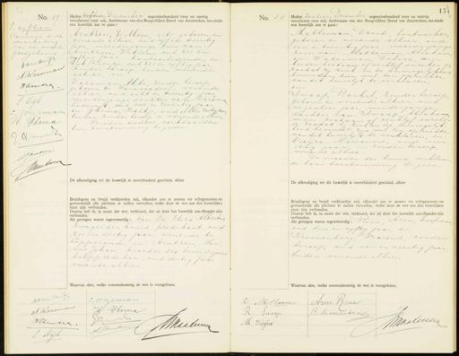 No. 27. vijftien envooi en de doorhaling van een woord goedgekeurd parnhuifr J Wereman Vambe. L. Mijb Wezeman H Vhema Armh D Jrntor Jrelar Heden Zestien December negentienhonderd twee en veertig verschenen voor mij, Ambtenaar van den Burgerlijken Stand van Amsterdam, ten einde een huwelijk aan te gaan: Arntzen Willem arts geboren en wonende alhier oud vijf en twintig jaar, meerderjarige zoon van: Arntzen, Willem oud zes en vijftig jaar, kantoorbediende, en Dijk, keentje oud zes en vijftig jaar zonder beroep, beiden wonende alhier, en Wezeman, Akke zonder beroep, geboren te Ferweradeel, wonende alhier, oud acht en twintig jaar meerderjarige dochter van: Wezeman Lodewijk oud vier en zeventig jaar, en: kema, Kielkje, oud acht en zestig jaar, beiden zonder beroep en wonende alhier Beider ouders verklaarden hun toestemming te geven De afkondiging tot dit huwelijk is onverhinderd geschied, alhier Bruidegom en bruid verklaarden mij, elkander aan te nemen tot echtgenooten en getrouwelijk alle plichten te zullen vervullen, welke door de wet aan den huwelijken staat zijn verbonden. Daarop heb ik, in naam der wet, verklaard, dat zij door het huwelijk aan elkander zijn verbonden. Als getuigen waren tegenwoordig: van Es. Eliza Albertus zwager der bruid, predikant, oud zes en dertig jaar, wonende te Loppersum, en: Arntzen, Mari„ nus Johan, broeder des bruidegoms hulpprediker, oud dertig jaar. wonende alhier. Waarvan akte, welke overeenkomstig de wet is voorgelezen. No. 28 Heden zestien December negentienhonderd twee en veertig verschenen voor mij, Ambtenaar van den Burgerlijken Stand van Amsterdam, ten einde een huwelijk aan te gaan: Matteman David, bontwerker geboren en wonende alhier, oud een en twintig jaar meerderjarige zoon van: Matteman, Abraham en: Waterman Debora, wier beider bestaan of verblijf onzeker is zoodat zij zich in de onmogelijkheid bevinden hun wil ten opzichte van dit huwelijk te verklaren, en. Swaap, Rschel, zonder beroep geboren en wonende alhier, oud negentien jaar, minderjarige dochter van: Swaap, Abraham wiens bestaan of verblijf onzeker is zoodat hij zich in de onmogelijk heid bevindt, zijn wil ten opzichte van dit huwelijk te verklaren en Vieyra, Marianne, oud veer tig jaar zonder beroep, wonende alhier De moeder der bruid verklaar de haar toestemming te geven De afkondiging tot dit huwelijk is onverhinderd geschied, alhier Bruidegom en bruid verklaarden mij, elkander aan te nemen tot echtgenooten en getrouwelijk alle plichten te zullen vervullen, welke door de wet aan den huwelijken staat zijn verbonden. Daarop heb ik, in naam der wet, verklaard, dat zij door het huwelijk aan elkander zijn verbonden. Als getuigen waren tegenwoordig: Rine Aron, koopman oud drie en vijftig jaar, en Kroonenberg Barend, zonder beroep, oud een en veertig jaar beiden wonende alhier Waarvan akte, welke overeenkomstig de wet is voorgelezen. Atrnkerse LWgeman A. Wezerman H Ikema Cinssch Kambre. NMaatiu MJndz L. Hlijk D: Ma Heman Aron: R.ene R. Swaap B. Kroonerberg JMreteuen M. Vieijra