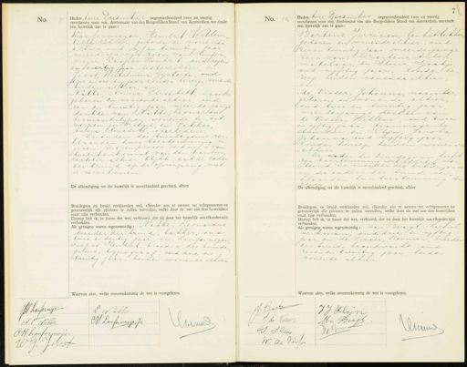 No. 1 Heden twee December negentienhonderd twee en veertig, verschenen voor mij, Ambtenaar van den Burgerlijken Stand van Amsterdam, ten einde een huwelijk aan te gaan: Lanfermeijer Hendrik Willem letterzitter, geboren en wonende alhier oud vijf en twintig jaar meerderjarige zoon van: anter, meyer Casper Hendrik, oud negen en veertig jaar letterzetter, en Joost, Wilhelmina Gijsberta oud drie en veertig jaar, zonder beroep, wonende beiden alhier, en Nabbe Anna Elisabeth, naarster geboren en wonende alhier oud een en twintig jaar, meerderjarge dochter van: Wabbe Leonardus diamantslijper wonende te Ant werpen in België, en: Pakkoo Anna lisabeth, overleden De ouders des bruidegoms ver klaarden hun toestemming te geven. Uit een proces verbaal van tusschenkomst van den kanton rechter alhier blijkt, dat de vader der bruid op de oproeping met is verschenen De afkondiging tot dit huwelijk is onverhinderd geschied, alhier Bruidegom en bruid verklaarden mij, elkander aan te nemen tot echtgenooten en getrouwelijk alle plichten te zullen vervullen, welke door de wet aan den huwelijken staat zijn verbonden. Daarop heb ik, in naam der wet, verklaard, dat zij door het huwelijk aan elkander zijn verbonden. Als getuigen waren tegenwoordig: Habbe, Leonardus broeder der bruid, bakker oud twee en dertig jaar, en: Lanfermeijer Casper Hendrik, broeder des bruide goms, ypograaf, oud drie en twintig jaar, beiden wonende alhier Waarvan akte, welke overeenkomstig de wet is voorgelezen. No. 12 Heden twee December negentienhonderd twee en veertig verschenen voor mij, Ambtenaar van den Burgerlijken Stand van Amsterdam, ten einde een huwelijk aan te gaan Bartens, Jurriaan, banketbakker geboren en wonende alhier, oud zes en twintig jaar, meerderjarig zoon van: Bartens, Anton makelaar, en Sluis, Sjaakje oud vijftig jaar, zonder be roep, beiden wonende alhier, en de Visser, Johanna, naarster, geboren en wonende alhier oud twee en twintig jaar meerderjarige dochter van de Visser, Willem, oud twee en vijftig jaar, tramwagenbe stuurder, en Klijn, Jacoba Johanna, oud vijftig jaar. zonder beroep, beiden wonende alhier De vader des bruidegoms heeft zijn toestemming schriftelijk ver Vleend De moeder des briedegoms en de ouders der bruid ver¬ klaarden hun toestemming te Gene De afkondiging tot dit huwelijk is onverhinderd geschied, alhier Bruidegom en bruid verklaarden mij, elkander aan te nemen tot echtgenooten en getrouwelijk alle plichten te zullen vervullen, welke door de wet aan den huwelijken staat zijn verbonden. Daarop heb ik, in naam der wet, verklaard, dat zij door het huwelijk aan elkander zijn verbonden. Als getuigen waren tegenwoordig: van Bragt, Machiel werkman, oud drie en vyftig jaar, en: de Visser, Keinier broeder der bruid brandwacht, oud zeven en twintig jaar, beiden wonende alhier Waarvan akte, welke overeenkomstig de wet is voorgelezen. J. Lanerije L V Ebls CH. Lanfermeije Jr A.E Sabbe Ahsenan CH Lanfermeyer WG.O 1VVot JJ: Boste JJ: Klijn J. de Visser Hn. Brage 701 Ollsumd S Sluis W. de Vissen