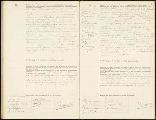 No. 135 Heden vijf Augustus negentienhonderd drie en veertig verschenen voor mij, Ambtenaar van den Burgerlijken Stand van Amsterdam, ten einde een huwelijk aan te gaan; Duker, Leendert, metaalschaver, geboren en wonende alhier, oud vijf en twintig jaar, meerderjarige zoon van: Duker, Leendert, oud negen en veertig jaar, letterzetter, en Aute, Geertruida Cornelia Ada, oud een en viftig jaar, zonder beroep. beiden wonende alhier, en Roerts, Mathilda, dienstbodegeboren en wonende alhier, oud negentien jaar, minderjarige dochter van: Koerts, Herman, magazijnknechtwonende alhier, en: de Wit, fo. hanna Alida, overleden. De ouders des bruidegoms verklaarden hun toestemming te geven. De vader der bruid heeft zijn toestemming schriftelijk verleend. De afkondiging tot dit huwelijk is onverhinderd geschied, alhier Bruidegom en bruid verklaarden mij, elkander aan te nemen tot echtgenooten en getrouwelijk alle plichten te zullen vervullen, welke door de wet aan den huwelijken staat zijn verbonden. Daarop heb ik, in naam der wet, verklaard, dat zij door het huwelijk aan elkander zijn verbonden. Als getuigen waren tegenwoordig: Duker, Carl Friedrich, oom des bruidegoms, machinezetteroud zes en vijftig jaar, en: Roerts, Herman, broeder der bruid, expe. ditiebediende, oud een en twintig jaar, beiden wonende alhier No. 134 „ des bruidegoms en de moeder Renvooi goed gekeurd. F Oostermeyen J.W. Kamp. F: Corlam. J. v. Vliet. A Glas J Pan K. Oostering Derd 22 Heden vijf Augustus negentienhonderd drie en veertig verschenen voor mij, Ambtenaar van den Burgerlijken Stand van Amsterdam, ten einde een huwelijk aan te gaan: Oostermeijer, Frederik, stoffeerden geboren en wonende alhier, oud een en twintig jaar, meerderjarige zoon van: Oostermeijer, Frederik, oud twee en veertig jaar, winkelbediende, en: van Vliet, Johanna, oud een en veertig jaar, zonder beroep, beiden wonende alhier, en Kamp- Janne Wilhelmina zonder beroep geboren en wonende alhier, oud negentien jaar, minderjarige dochter van: Kamp, Hendrik wiens bestaan of verblijf onzeker is. zoodat hij moet worden geacht zich in de onmogelijkheid te bevinden zijn wil ten opzichte van dit huwelijk te verklaren, en: Glas, Aaltje, oud drie en vijftig jaar, - zonder beroep, wonende alhier. De oudersder bruid verklaarden hun toestemming te geven. De afkondiging tot dit huwelijk is onverhinderd geschied, alhier Bruidegom en bruid verklaarden mij, elkander aan te nemen tot echtgenooten en getrouwelijk alle plichten te zullen vervullen, welke door de wet aan den huwelijken staat zijn verbonden. Daarop heb ik, in naam der wet, verklaard, dat zij door het huwelijk aan elkander zijn verbonden. Als getuigen waren tegenwoordig: Kamp, Jan, broeder der bruid, fabrieksarbeider, oud zeven en twintig jaar, en: Postermeijer, Rarel, oom des bruidegoms, rijwilhersteller, oud negen en dertig jaar, beiden wonende alhier Waarvan akte, welke overeenkomstig de wet is voorgeleze Caut t daken L Duker Meut J x Mathitda Koerts. Maarns Duker A: Cute A Glas F. Oostermeyer JSan llezed J.W. Kamp J Vostermyn K. Oostering v Vliet.