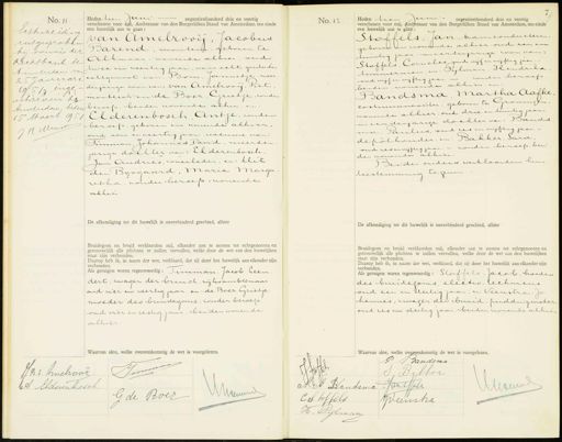 No. 11. No. 11. leptschelding uitgesproken bij voune der Lechtbank te A mitiedan van 25 Januari 19.5/ inge schtevente Anderdam, helen 15 Maart 1951 JRMman Heden tien Juni negentienhonderd drie en veertig verschenen voor mij, Ambtenaar van den Burgerlijken Stand van Amsterdam, ten einde een huwelijk aan te gaan: van Amelrooij, Jacobus Barend, monkeur, geboren te Alkmaar, wonende alhier, oud twee en veertig jaar, van echt gescheider Jectgenoot van: Bom, Jannetje, meer derjarige voor van: van Amelrooy, Piet monteui,en: de Boer, Griekje, zonder beroep, beiden wonende alhier, in: Elderenbosch Antje, zouder beroep, geboren en wonende alhier, oud een en veertig jaar, meduwe van: Timman, Johannes Pavid, meerder jarige dochter van: Elderenbosch Jan Andries, overleden, en: Uit den Boogaard, maria Marga retha, zonder beroep wonende alhier De afkondiging tot dit huwelijk is onverhinderd geschied, alhier Bruidegom en bruid verklaarden mij, elkander aan te nemen tot echtgenooten en getrouwelijk alle plichten te zullen vervullen, welke door de wet aan den huwelijken staat zijn verbonden. Daarop heb ik, in naam der wet, verklaard, dat zij door het huwelijk aan elkander zijn verbonden. Als getuigen waren tegenwoordig: Timman, Jacob Leen dert, zwager der bruid, rijksambtenaar oud vier en veertig jaar, en: de Boer Grietje moeder des bruidegoms, zonder beroep oud vier en zestig jaar, beiden wonende alhier. Waarvan akte, welke overeenkomstig de wet is voorgelezen. No. 12 Heden tien Juni negentienhonderd drie en veertig verschenen voor mij, Ambtenaar van den Burgerlijken Stand van Amsterdam, ten einde een huwelijk aan te gaan: Stoffels; Jan-aamcondueteur geboren en wonende alhier, oud een in twintig jaar, meerderjarige zoon van Stoffels, Cornelis oud vijf en vijftig jaar.timmerman, en: Tijlman, Hendrika oud vijf en vijftig jaar zonder beroep leiden wonende alhier, in Bandsma, martha Aalke cortinmnaarster, geboren te Groningen wonende alhier, oud drie en twintig jaar meerderjarige dochter van: Bands ma, Paulus, oud zes en vijftig jaar. depothouder, en: Bakker, Sara oud zesen vijftig jaar. - zonder beroep, bei den wonende alhier Beider ouders, verklaarden hun toestemming te genen De afkondiging tot dit huwelijk is onverhinderd geschied, alhier Bruidegom en bruid verklaarden mij, elkander aan te nemen tot echtgenooten en getrouwelijk alle plichten te zullen vervullen, welke door de wet aan den huwelijken staat zijn verbonden. Daarop heb ik, in naam der wet, verklaard, dat zij door het huwelijk aan elkander zijn verbonden. Als getuigen waren tegenwoordig: Slaffels, Jacob, broeder des bruidecoms, electio- technicus oud een en dertig jaar, in Veenstra. Jo hannes, zwager der bruid, puddingmaker oud zes en dertig jaar beiden wonende alhier Waarvan akte, welke overeenkomstig de wet is voor Timn J.B. v. Bnehoor A Elderenbosch. WMmmmeeel G de Boer P Bandsma J Jof S. Bikker Moamd A: A: Landsma J Joraffele C.S: toffels eenshra H. Pijlman