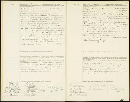 No. 13 Heden tien Juni negentienhonderd drie en veertig verschenen voor mij, Ambtenaar van den Burgerlijken Stand van Amsterdam, ten einde een huwelijk aan te gaan: Kans Hermanus Pieter kantoorbediende, geboren en wonende alhier, oud acht en twintig jaar, meer derjarige voor van: Kans, Hermanus Pieter, oud een en zestig jaar. schoenma ker. en: Bonke, Gerharda Chris tina, oud acht en vestig jaar. zouder be roep, beiden wonende alhier, en; ten Have, Johanna Petro- nella, verkoopster, geboren en wonende alhier, oud vijf en twintig jaar, meerder jarige dochter van: ten Have, Petrus oud zes en vijftig jaar. — hoofdtren conducteur en: van der Weerd, Johanna Marid oud ver en vijftig jaar.- zonder beroep, bei- den wonende alhier. Beiden ouders verklaarden hun toestemming te genee De afkondiging tot dit huwelijk is onverhinderd geschied, alhier Bruidegom en bruid verklaarden mij, elkander aan te nemen tot echtgenooten en getrouwelijk alle plichten te zullen vervullen, welke door de wet aan den huwelijken staat zijn verbonden. Daarop heb ik, in naam der wet, verklaard, dat zij door het huwelijk aan elkander zijn verbonden. Als getuigen waren tegenwoordig: Bottenhon, Coenraad Kanciseus, zwager des bruidegoms, kantoor bediende, oud drie en veertig jaar. en ten Have, Februs, broeder der bruid, kantoorbediende oud drie en twintig jaar, bei den wonende alhier Waarvan akte, welke overeenkomstig de wet is voorgelezen. No. 14. Heden tien Juni negentienhonderd drie en veertig verschenen voor mij,Ambtenaar van den Burgerlijken Stand van Amsterdam, ten einde een huwelijk aan te gaan: Vleerlaag, Simon martinus schoenmaker geboren en wonende alhier oud vier en tintig jaar meerderjarige zoon van: Vleerlaar, Btrus, oud zes en vijftig jaar. - mogaryn bediende wonende alhier. in: Scheerboom, mans Engelina, overleden. in matla, maria Johanna zouder beroep, gebouen en wonende alhier oud vier en twintig jaar, meerderjarige dochter van: Makla, Johannes Hu bertus Hendricus, oud acht en vijftig jaar werkman, wonende alhier. in: Pilarski, Maria, overleden kle beide vaders verklaarden hun toestemming te geven De afkondiging tot dit huwelijk is onverhinderd geschied, alhier Bruidegom en bruid verklaarden mij, elkander aan te nemen tot echtgenooten en getrouwelijk alle plichten te zullen vervullen, welke door de wet aan den huwelijken staat zijn verbonden. Daarop heb ik, in naam der wet, verklaard, dat zij door het huwelijk aan elkander zijn verbonden. Als getuigen waren tegenwoordig: Hleerlag Martinus Johannes, broeder des bruidecoms, politie acent, oud zes en twintig jaar, en: Meerte neau, Louise, schoonzuster des buui de coms zonder beroep, oud vijf en twintig jaar, beiden wonende alhier Waarvan akte, welke overeenkomstig de wet is voorgelezen. J Cm C P: ten Kan Mtaamw A M vd Weerd. J.P. ten Have P Sb. H. F. Kans„ Jan Hae J C Bonke S: M. Vleerlvn M.Heirkzag Mgeuum M. J. Matla L: Jnartincau 8 ¶ Heerlamen J HH Matte