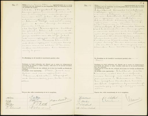No. 13 Heden vier en twintig ier negentienhonderd vier en veertig verschenen voor mij, Ambtenaar van den Burgerlijken Stand van Amsterdam, ten einde een huwelijk aan te gaan: Veen, mijndert Tijmen, be hanger, geboren en wonende alhier, oud vier en twintig jaar, meerderjarige zoon van: Veen, Johan Hendrik oud zeegen en vijftig jaar. — magazijn bediende en: Schurink, Dirkje, oud acht en veertig jaar. — zonder beroep, beiden wonende alhier, en: de Wijs, Tennegien, boekhoud ster, geboren in scheemda, wonende al hier, oud acht en twintig jaar, meerder jarige dochter van: de Eeys, Jakob oud vier en vijftig jaar. - brandstaffen handelaar, en: Burema Cornelia oud drie en vijftig jaar. -, zonder beroep beiden wonende alhier. Beider ouders verklaarden hun toestem ming te geven. De afkondiging tot dit huwelijk is onverhinderd geschied, alhier Bruidegom en bruid verklaarden mij, elkander aan te nemen tot echtgenooten en getrouwelijk alle plichten te zullen vervullen, welke door de wet aan den huwelijken staat zijn verbonden. Daarop heb ik, in naam der wet, verklaard, dat zij door het huwelijk aan elkander zijn verbonden. Als getuigen waren tegenwoordig: Bos, Jacob, win kelier, oud zes en vijftig jaar, en Blaauw, Abraham, telegrafist, oud twee en dertig jaar, beiden wonende alhier Waarvan akte, welke overeenkomstig de wet is voorgelezen. No. 14 Heden vier en twintig mei negentienhonderd vier en veertig verschenen voor mij, Ambtehaar van den Burgerlijken Stand van Amsterdam, ten einde een huwelijk aan te gaan: Schotherst, Cornelis Wilhelmus, melkslijter, geboren en wonende in Baarn oud zes en twintig jaar, m eerderjarige zoon van: Schothorst, Cornelis, oud zes en vijftig jaar. — melkslijker, in: Schoonderbeek, maria, oud zes en vijftig jaar. zonder beroep beiden wonende in Baarn, en„ menken, Geertruida Maria Catharina, zonder beroep, geboren en wonende alhier, oud dertig jaar meerderjarige dochter van: Menken Gerardus Andreas Alexander kantoorbediende, in: Buschman, Catharina Geertruida Maria zonder beroep, beiden wonende alhier de ouders des bruidegoms ver klaarden hun toestemming te geven De afkondiging tot dit huwelijk is onverhinderd geschied, alhier en in Baarn Bruidegom en bruid verklaarden mij, elkander aan te nemen tot echtgenooten en getrouwelijk alle plichten te zullen vervullen, welke door de wet aan den huwelijken staat zijn verbonden. Daarop heb ik, in naam der wet, verklaard, dat zij door het huwelijk aan elkander zijn verbonden. Als getuigen waren tegenwoordig: Schothorst, Jacoba Cornelia, zuster des bruidegoms. zonder beroep, oud acht en twintig jaar wonende in Hilversum, en: Men ken, Josephus Hendricus, broeder der bruid, inspecteur bij een verzekering maatschappij, oud vijf en dertig jaar, wonende alhier Waarvan akte, welke overeenkomstig de wet is voorgelezen. MV Veer J de Wijs CBurema van soest O1 J