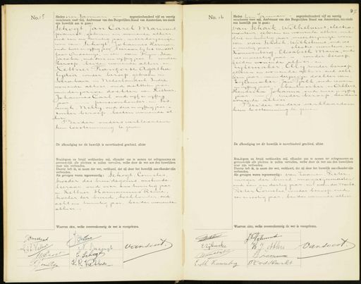 No.15 Heden vier Januari negentienhonderd vijf en veertig verschenen voor mij, Ambtenaar van den Burgerlijken Stand van Amsterdam, ten einde een huwelijk aan te gaan: Schogt, Jan Carel Marinus pianst, geboren en wonende alhier oud een en twintig jaar, meerderjarige zoon van: Schogt, Johannes Herman oud twee en vijftig jaar Heeraar bij het middel baar Onderwijs, —en: van Ryn, Sda Jacoba, oud drie en vijftig jaar. — zonder beroep, beiden wonende alhier. in Kettuer, Rancoise Agatha tijdia, zonder beroep, geboren in Soerabaia in Nederlandsch. Indië wonende alhier, oud achttien jaar minderjarige dochter van Rettuer, Johannes Carl oud vijf en vijftig jaar. — pensionhouder, in: sis. sinch, Kellij, oud drie en vijftig jaar.- zonder beroep, beiden wonende al Chier zeider ouders verklaarden hun toestemming te geven De afkondiging tot dit huwelijk is onverhinderd geschied, alhier Bruidegom en bruid verklaarden mij, elkander aan te nemen tot echtgenooten en getrouwelijk alle plichten te zullen vervullen, welke door de wet aan den huwelijken staat zijn verbonden. Daarop heb ik, in naam der wet, verklaard, dat zij door het huwelijk aan elkander zijn verbonden. Als getuigen waren tegenwoordig: Schogt, Cornelis broeder des bruidegoms, wiskunde leeraar, oud vier en twintig jaar en: Kettuer, Harmannus Reme broeder der bruid, boekhouder, oud acht en twintig jaar, beiden wonende alhier. Waarvan akte, welke overeenkomstig de wet is voorgelezen No. 16 Heden tien Januari negentienhonderd vijf en veertig verschenen voor mij, Ambtenaar van den Burgerlijken Stand van Amsterdam, ten einde een huwelijk aan te gaan: van Schaik, wilhelmus elecho monteur, beboren en wonende alhier, oud drie en twintig jaar, meerderjarige won van van Schaik, Wilhelmus, oud zes en veertig jaar. — Mlectro- monteur, en ouwenberg, Elisabeth Maria, oud zes en veertig jaar. — zonder beroep, beiden wonende alhier, en tijlemaker, Ellij, zonder beroep geboren en wonende alhier, oud acht tien jaar, minderjarige dochter van bijlemaker, Jan Tjalk, oud zeven en vijftig jaar.- bankuerker, in Ahlers Hendrika Johanna, oud twee en vijftig jaar.zonder beroep, beiden wonende alhier Beider ouders verklaarden hun testemming te gevers De afkondiging tot dit huwelijk is onverhinderd geschied, alhier Bruidegom en bruid verklaarden mij, elkander aan te nemen tot echtgenooten en getrouwelijk alle plichten te zullen vervullen, welke door de wet aan den huwelijken staat zijn verbonden. Daarop heb ik, in naam der wet, verklaard, dat zij door het huwelijk aan elkander zijn verbonden. Als getuigen waren tegenwoordig: van Zaanen, Pieter wager der bruid, magazynmeester oud een en dertig jaar, in van der markt, Pieter Cornelis, zonder beroep, oud een en zestig jaar, beiden wonende alhier Waarvan akte, welke overeenkomstig de wet is voorgelezen. Cheltne Jmschees 7 van soest A.L. Wetter N. Surngt
