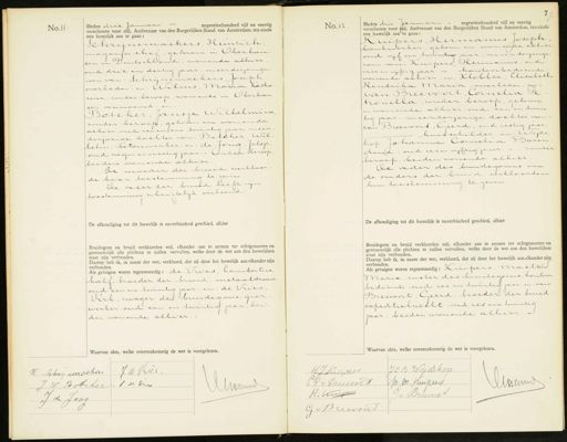 No.11. Heden drie Januari negentienhonderd vijf en veertig verschenen voor mij, Ambtenaar van den Burgerlijken Stand van Amsterdam, ten einde een huwelijk aan te gaan: Schrijnemackers, Heinrich, magarijn thef, gelovem in Oberhau- sen in Duitschland, wonende alhier oud drie en dertig jaar, meerderjarige zoon van: Schrynemalkers, Joseph overleden. en: Wilms, Maria Katha rina, zonder beroep, wonende in Oberhau ten bovnseni, en Botcher, Jansje Wilhelmina zonder beroep, geboren en wonende alhier, oud zeven en twintis jaars meer derjarige dochter van: Botcher, Wil helm, betouwerker, en: de Jong. Jelsje oud negen en veertig jaar. - znder beroep beiden wonende alhier De moeder der bruid verklaar- de haor toestemming te geven ke vader der bruid heeft zijn toestemming schriftelijk verleend De afkondiging tot dit huwelijk is onverhinderd geschied, alhier Bruidegom en bruid verklaarden mij, elkander aan te nemen tot echtgenooten en getrouwelijk alle plichten te zullen vervullen, welke door de wet aan den huwelijken staat zijn verbonden. Daarop heb ik, in naam der wet, verklaard, dat zij door het huwelijk aan elkander zijn verbonden. Als getuigen waren tegenwoordig: de Vries, Lambertus, half- broeder der bruid, metaaldraaier oud een en twintig jaar, in: de Vries, Dirk, zwager des bruideooms, ijzer werker, oud een en twintig jaar, bei den wonende alhier.- Waarvan akte, welke overeenkomstig de wet is voorgelezen. No. 12 Heden drie Januari- negentienhonderd vijf en veertig verschenen voor phij, Ambtenaar van den Burgerlijken Stand van Amsterdam, ten einde een huwelijk aan te gaan: Kuipers, Hermanus Joseph bankwerker, geboren en wonende alhier oud vijf en twintig jaar, meerderjarige zoon van: Kuipers, Hermanus, oud vier en vijftig jaar. — kantoorbediende wonrende alhier, n: Klobbee, Elisabeth Hendrika Mraria, overleden. van Breevoort, Cornelia Pe tronella, zonder beroep, geboren in wonende alhier, oud een en turn tes jaar, meerderjarige dochter van van Breevoort, Ceerd, oud zestig jaar. huisschilder, en: Wijde kop, Johanna Cornelia Baren dind, oud zes en vijftig jaar. - zonder beroep, beiden wonende alhier. kle iader des bruidegous en de ouders der bruid verkloarden hun toestemming te geven De afkondiging tot dit huwelijk is onverhinderd geschied, alhier Bruidegom en bruid verklaarden mij, elkander aan te nemen tot echtgenooten en getrouwelijk alle plichten te zullen vervullen, welke door de wet aan den huwelijken staat zijn verbonden. Daarop heb ik, in naam der wet, verklaard, dat zij door het huwelijk aan elkander zijn verbonden. Als getuigen waren tegenwoordig: Kupers, machtel Maria, zuster des bruidegoms, kantoor bediende oud zes en twintig jaar, en: van Breevoort, Geerd, broeder der bruid expeditiekwecht, oud zes en twintig jaar, beiden wonende alhier. rvan a , welke overeenkomstig de wet is voorgelezen. H: Schrynemachas J de Vries. J W Boteher de Vres MMaml J de Jong HJ Dicipers JCB Wijdekop J. W. Ruisjers lrann GP. v Breevoort H. Kuipen G. v. Breevoort G v Breevoort