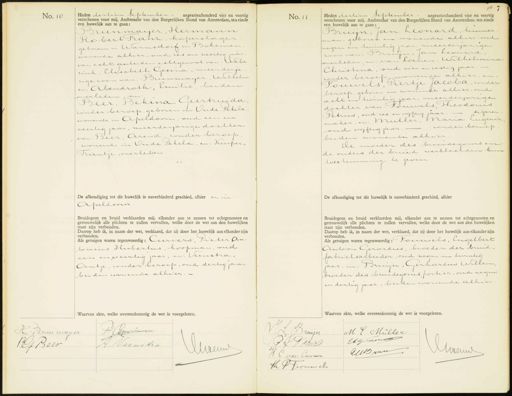 No. 10 Heden dertien September negentienhonderd vier en veertig verschenen voor mij, Ambtenaar van den Burgerlijken Stand van Amsterdam, ten einde een huwelijk aan te gaan: Brunmaijer, Hermann Robert Kanz, koperslager geboren in Warnsdorf in Bohemen wonende alhier, oud zes en veertig jaar van echt gescheiden echtgenoot van: Webe rink, Elisabeth Gesina, meerderja rige zoon van: Brunmaier, Wilhelm en: Abendroth, Emilie, beiden overleden, en: Beer, Bekina Geertruida zonder beroep geboren in Oude Pebela wonende in Opeldoom, oud een en veertig jaar, meerderjarige dochter van: Beer, Arend, zonder beroep, wonende in Oude Pekela, en: Kuiper, Prientje, overledeen 3. De afkondiging tot dit huwelijk is onverhinderd geschied, alhier en in Apeldoorn Bruidegom en bruid verklaarden mij, elkander aan te nemen tot echtgenooten en getrouwelijk alle plichten te zullen vervullen, welke door de wet aan den huwelijken staat zijn verbonden. Daarop heb ik, in naam der wet, verklaard, dat zij door het huwelijk aan elkander zijn verbonden. Als getuigen waren tegenwoordig: Curvers, Pieter An tonius Hubertus, koopman, oud een en veertig jaar, en: Veenstra, Antje, zonder beroep, oud dertig jaar beiden wonende alhier.— Waarvan akte, welke overeenkomstig de wet No. 11. ean herelk in te gun. vombet aede Heden dertien 1 veertig verschenen voor mij, Ambtenaar van den Burgerlijken Stand van Amsterdam, ten einde Bruijn, Jan Leonard, timmer man, geboren en wonende alhier, oud negen en twintig jaar, meerderjarige zoon van: Bruyn, Jan Leonard, overleden, in: van Loenen, Wilhelmin Christina, oud vier en zestig jaar. zonder beroep, wonende alhier, en: Pouwels, Piertje Jacoba, zonder beroep, geboren en wonende alhier, oud acht en twintig jaar, meerderjarige dochter van: Rouwels Theodorus Petrus, oud zes en vijftig jaar. — ti garen maker, en: Muller, Maria Eugenia oud vijftig jaar. — zonder beroep beiden wonende alhier. De moeder des bruidegoms en de ouders der bruid verklaarden hun toestemming te geven De afkondiging tot dit huwelijk is onverhinderd geschied, alhier Bruidegom en bruid verklaarden mij, elkander aan te nemen tot echtgenooten en getrouwelijk alle plichten te zullen vervullen, welke door de wet aan den huwelijken staat zijn verbonden. Daarop heb ik, in naam der wet, verklaard, dat zij door het huwelijk aan elkander zijn verbonden. Als getuigen waren tegenwoordig: Pouwels, Engelbert Antoon Gerardus, broeder der bruid fabrieksarbeider, oud negen en twintig jaar, en: Bruijn, Gerhardus Willem broeder des bruidegoms portier, oud negen en dertig jaar, beiden wonende alhier Waarvan akte, welke overeenkomstig de wet is voorgelezen. P Clen H: Drunmager PG Beer 7 Veenstra Mreuml