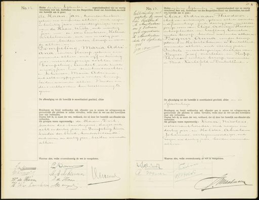 No. 12 Heden dertien September negentienhonderd vier en veertig verschenen voor mij, Ambtehaar van den Burgerlijken Stand van Amsterdam, ten einde een huwelijk aan te gaan: de Haan, Jan, tramconducteur geboren en wonende alhier, oud negen en twintig jaar, meerderjarige zoon van: de Haan, Wiebe, oud zeventig jaar. — en: van Lunteren, Helena Wilhelmina, oud een en zestig jaar. beiden zonder beroep en wonen- de alhier, en Dompeling, Maria Adri 9 Jana, zonder beroep, geboren en wonende alhier, oud vijf en twintig jaar, meerderjarige dochter van Dompelins, Leendert, oud twee en zestig jaar. — seinhuiswachter, en: Schieveen, maria Adriana oud acht en vijftig jaar. — zonder beroep, beiden wonende alhier. Beider ou ders verklaarden hun toestemming te geven. De afkondiging tot dit huwelijk is onverhinderd geschied, alhier Bruidegom en bruid verklaarden mij, elkander aan te nemen tot echtgenooten en getrouwelijk alle plichten te zullen vervullen, welke door de wet aan den huwelijken staat zijn verbonden. Daarop heb ik, in naam der wet, verklaard, dat zij door het huwelijk aan elkander zijn verbonden. Als getuigen waren tegenwoordig: de Haan, Dirk broeder des bruidegoms, slager, oud acht en dertig jaar, en Dompeling, Simon„ broeder der bruid, kantoorbediende, oud zeven en dertig jaar, beeden wonende alhier Waarvan akte, welke overeenkomstig de wet is voorgelezen. No. 13. Vo. 13. Echtscheiding uit- gesproker bbi voorne der Rechtbank e Amsterdam van 7 Februari 1946 ingeschreven te Amsterdam heden 24 September 191 JCUan Heden vijftien September — negentienhonderd vier en veertig verschenen voor mij, Ambtenaar van den Burgerlijken Stand van Amsterdam, ten einde een huwelijk aan te gaan: Elias, Aadriaan Theodoor chef van ontvangst, geboren alhier, wonende n '& Gravenhage, oud dertig jaar, meerder jarige zoon van: Elias, Adriaan Theodoor inkoopleider, en: Leeflang, Cornelia zonder beroep, beiden wonende alhier, Bogner, Anna, zonder beroep geboren in Hebertshausen en Duitschland wonende alhier, oud veertig jaar Duitsche, meerderjarige dochter van: Bagner, Josef, overleden, en: Kupp Therese, zonder beroep, wonende in Bad- Karlsfeld in Duitschland De afkondiging tot dit huwelijk is onverhinderd geschied, alhier en in s Gravenhage Bruidegom en bruid verklaarden mij, elkander aan te nemen tot echtgenooten er getrouwelijk alle plichten te zullen vervullen, welke door de wet aan den huwelijken staat zijn verbonden. Daarop heb ik, in naam der wet, verklaard, dat zij door het huwelijk aan elkander zijn verbonden. Als getuigen waren tegenwoordig: Kroese, Nicolaas, testaurant houder, oud negen en dertig jaar, en: Holster, Abraham Johannes, vertegenwoordiger, oud negen en dertig jaar, beiden wonende alhier. Waarvan akte, welke overeenkomstig de wet is voorgelezen. 7 Homr J deMa M.C. Dompeti M A Schiereer Auzenm W de Haan D de Haan H W v Lrunteren Domgcl Ncotaris Aeli A. Baquer GJPols Maaliaar