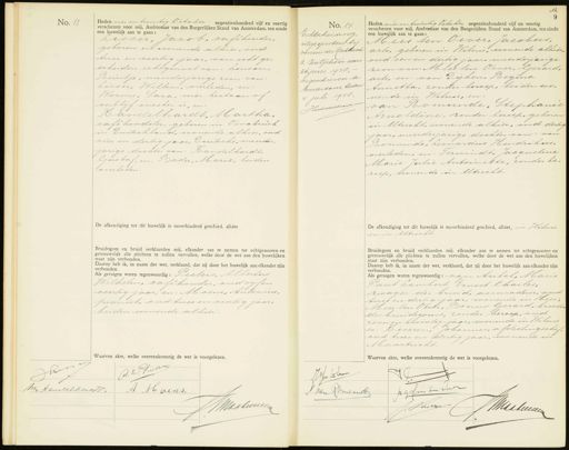 No. 13 Heden vier en twintig October negentienhonderd vijf en veertig verschenen voor mij, Ambtenaar van den Burgerlijken Stand van Amsterdam, ten einde een huwelijk aan te gaan: Lisser, Jacob, caféhouder, geboren en wonende alhier, oud twee en veertig jaar, van echt ge„ scheiden echtgenoot van: tenson, Rentje, meerderjarige zoon van: Lisser, Willem, overleden, en: Worms, Sara, wier bestaan of verblijf onzeker is, en Randelhardt, Martha, caféhoudster, geboren in Osnabruck in Duitschland, wonende alhier, oud vier en dertig jaar, Duitsche, meerder„ jarige dochter van: Randelhardt. Gustaf, en: Bader, Marie, beiden overleden. De afkondiging tot dit huwelijk is onverhinderd geschied, alhier Bruidegom en bruid verklaarden mij, elkander aan te nemen tot echtgenooten en getrouwelijk alle plichten te zullen vervullen, welke door de wet aan den huwelijken staat zijn verbonden. Daarop heb ik, in naam der wet, verklaard, dat zij door het huwelijk aan elkander zijn verbonden. Als getuigen waren tegenwoordig: Peeters, Albertus Wilhelm, caféhouder, oud vijf en veertig jaar, en: Moens, Antonius, Juanist, oud twee en veertig jaar, beiden wonende alhier Waarvan akte, welke overeenkomstig de wet is voorgele No. 14 No. 14 Echtscheiding, uitgesproken by vonnis der Rechtbank te Zutphen van 26 uni 1958,- Ingeschreven te Amsterdam, heden 4 Juli 1958. Hulsullena Heden vier en twintig October negentienhonderd vijf en veertig verschenen voor mij, Ambtenaar van den Burgerlijken Stand van Amsterdam, ten einde een huwelijk aan te gaan: Mees ten Oever, Jacobus, 6 arts, geboren in Wilmis, wonende alhier oud een en dertig jaar, meerderjarige zoon van: Meesten Oever, Gerard, arts, en: van Dijken, Regina Annetta, zonder beroep, beiden wo- nende in Wilnis, en van Romunde, Stephanil Arnoldinc, zonder beroep, geboren in Utrecht, wonende alhier, oud dertig jaar, meerderjarige dochter van: van Komunde, Leonardus Hendrikus, overleden, en: Terwindt, Jacqueline Marie Julie Antoinette, zonder be- roep, wonende in Utrecht. De afkondiging tot dit huwelijk is onverhinderd geschied, alhier, in Wilnis en in Utrecht Bruidegom en bruid verklaarden mij, elkander aan te nemen tot echtgenooten en getrouwelijk alle plichten te zullen vervullen, welke door de wet aan den huwelijken staat zijn verbonden. Daarop heb ik, in naam der wet, verklaard, dat zij door het huwelijk aan elkander zijn verbonden. Als getuigen waren tegenwoordig: van Aubel, Maria Paul Lambert Ernest Charles, zwager der bruid, assuradeur, oud twee en dertig jaar, wonende in Heer; Mees ten Oever, Bonno Gerard, broede des bruidegoms, zonder beroep, oud zeven en twintig jaar, wonende in Wiluis en: Civeron, Johannes, afdeelingschep oud twee en dertig jaar, wonende in Maastricht. D G. W Toek M. Landelhorens. A: Moens. Maalenee JWr. Cobe f „ B.G. am Sar J Van Pomtind AKwveren WMeetuen 7.