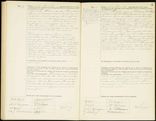 No. 79 Heden veertien November negentienhonderd vijf en veertig verschenen voor mij, Ambtenaar van den Burgerlijken Stand van Amsterdam, ten einde een huwelijk aan te gaan: Thoel, Hermanus Hendri kus, magazijnbediende, geboren in Zutphen, wonende in Amersfoort. oud zeven en twintig jaar, meerder jarige zoon van: Spoel, Antonius, oIdnegen en veertig jaar, tid, en: Hendriksen, Maria Johanna, oud negen en veertig jaar zonder beroep, beiden wonende in Amersfoort, en: Koopman, Cornelia Catharina Maria, zonder beroep, geboren en wonende alhier. oud zes en twintig jaar, meerderjarige dochter van: Koopman, Ringer Jacobus, oud acht en viftig jaar, magazijnbediende, en: zablans, Johanna Petronella, oud acht en vijftig jaar. zonder beroep, beiden wonende alhier. Beider ouders verklaarden hun toestemming te geven: De afkondiging tot dit huwelijk is onverhinderd geschied, alhier en in Amersfoort. Bruidegom en bruid verklaarden mij, elkander aan te nemen tot echtgenooten en getrouwelijk alle plichten te zullen vervullen, welke door de wet aan den huwelijken staat zijn verbongen. Daarop heb ik, in naam der wet, verklaard, dat zij door het huwelijk aan elkander zijn verbonden. As getuigen waren tegenwoordig: Roopman, Nicolaas Lodewyk, broeder der bruid, monteur. oud een en dertig jaar, wonende alhier, en: Spoel, Gerardus Hendrikus broeder des bruidegoms, bankwerker, oud vier en dertig jaar, wonende in Amersfoort. Waarvan akte, welke overeenk No. 80 No. 80 Echtscheiding. uitgenokuw bij voorwit der rechtbank te Amsterdam tar 8 Juni 1961, ingeschreven te amster dam, Leden, d augustus 1961.I Heden veertien November negentienhonderd vijf en veertig verschenen voor mij, Ambtenaar van den Burgerlijken Stand van Amsterdam, ten einde een huwelijk aan te gaan: van Hofwegen, Petrus Willen soldaat bij het Nederlandsche leger, geboren en wonende alhier, oud twintig jaar, minderjarige zoon van: van Hofwegen, Johannes Marinus, oud vier en veertig jaar, - cartonnagewerker, en: Achterberg, Jannetje, oud zeven en veertig jaar,zonder beroep. beiden wonende alhier, en: Kurpel, Jansje, kantoorbediende, geboren en wonende alhier. oud drie en twintig jaar, meerderjarige dochter van: Wurpel, Frederik Cornelis, oud vijf en vijftig jaar, buurstoker, en: Polman, Hendrika oud een en vijftig jaar, zonder beroep, beiden wonende alhier. Beider ouders verklaarden hun toestemming te geven De afkondiging tot dit huwelijk is onverhinderd geschied, alhier Bruidegom en bruid verklaarden mij, elkander aan te nemen tot echtgenooten en getrouwelijk alle plichten te zullen vervullen, welke door de wet aan den huwelijken staat zijn verbonden. Daarop heb ik, in naam der wet, verklaard, dat zij door het huwelijk aan elkander zijn verbonden. Als getuigen waren tegenwoordig: Solman, Jan, groot. vader der bruid, oud negen en zeventig jaar, en: Achterberg, Willem, grootvader des bruidegoms, oud acht en zeventig jaar, beiden zonder beroep en wonende alhier. Waarvan akte, welke overeenkomstig de wet is voorgelezen. HH Spoel Joopvan CC. M Koofman. J: P: Leablans Piemuming A Spoel Noof M J Hendrikzen JLpo AW Hulgen F C Wurpel. J. Wipel H Jolman Beekuan J M v. Holwege J. Palman 9 Wetchterberg J. Asterberf