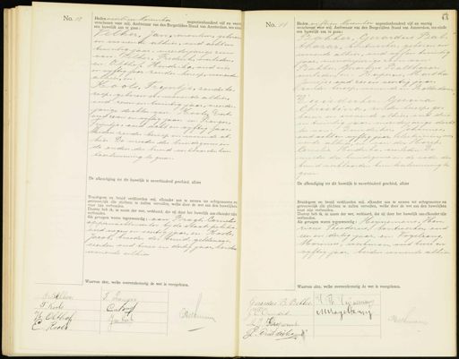 No. 85 Hedenveertien November negentienhonderd vijf en veerverschenen voor mij, Ambtenaar van den Burgerlijken Stand van Amsterdam, ten eing een huwelijk aan te gaan Velker, Jan, monteur, geboren en wonende alhier, oud acht en twintig jaar, meerderjarige zoon van: Velker, Frederik, overleden. en: Elthof Hendrika, oud vier en vyftig jaar, zonder beroep, wonende alhier, en Rools, Trijntje, zonder beroep, geboren en wonende alhier, oud zeven en twintig jaar, meerderjarige dochter van: Rools, Evertoud zeven en viftig jaar, en Pranger, Trijntje, oud acht en vijftig jaar. beiden zonder beroep en wonende al hier. De moeder des bruidegoms en de ouders der bruid verklaarden hun toestemming te geven. De afkondiging tot dit huwelijk is onverhinderd geschied, alhier Bruidegom en bruid verklaarden mij, elkander aan te nemen tot echtgenooten en getrouwelijk alle plichten te zullen vervullen, welke door de wet aan den huwelijken staat zijn verbonden. Daarop heb ik, in naam der wet, verklaard, dat zij door het huwelijk aan elkander zijn verbonden. Als getuigen waren tegenwoordig: van Bragt, Cornelis opperwachtmeester bij de staatspolitie oud negen en veertig jaar, en: RoolsJacob, broeder der bruid, geldincas. seerder, oud twee en dertig jaar, beiden wonende alhier. Waarvan akte, welke overeenkomstig de mer is „No. 86 Heden vijftien November negentienhonderd vijf en veertig verschenen vóor mij, Ambtenaar van den Burgerlijken Stand van Amsterdam, ten einde een huwelijk aan te gaan: Bakker, Gerardus Balthazar, bontwerker, geboren en wonende alhier, oud vijf en twintig jaar, meerderjarige zoon van: Bakker, Gerardus Balthazar, overleden, en: Kuperus, Martha Jansje, oud zes en veertig jaar. zonder beroep, wonende in Rotterdam en Duisderker, Gesna Christina, zonder beroep, geboren en wonende alhier, oud drie en twintig jaar, meerderjarige dochter van: Duisdeiker, Johannes, oud acht en viftig jaar, Mectricien, wo nende alhier, en: van der Horst, Cornelia Hendrika, overleden. De moeder des bruidegoms en de vader der bruid verklaarden hun toestemming te geven: De afkondiging tot dit huwelijk is onverhinderd geschied, alhier Bruidegom en bruid verklaarden mij, elkander aan te nemen tot echtgenooten en getrouwelijk alle plichten te zullen vervullen, welke door de wet aan den huwelijken staat zijn verbonden. Daarop heb ik, in naam der wet, verklaard, dat zij door het huwelijk aan elkander zijn verbonden. Als getuigen waren tegenwoordig: Heynemans, Henricus Theodorus, bontwerker, oud een en dertig jaar, en: Vogelzang, Marinus, werkman, oud twee en vijftig jaar, beiden wonende alhier Waarvan akte, welke overeenkomstig de wet is voorgelezen. =de wet is voorgelezen. J Velher J. Vander T. Kools CBro Pethuinnn H Olthaf Ja kort HRoold Geradeet. B. Beklel Th. Juinemans 11 Milagelhung G. C. Ouiseerk Pelhunnin M. J Deeperus. J: Deusderkiend