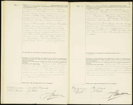 Heden vier en twintig October negentienhonderd vijf en veertig verschenen voor mij, Ambtenaar van den Burgerlijken Stand van Amsterdam, ten einde een huwelijk aan te gaan: Hidding, Gerrit, koopman. geboren in Dalen, wonende in Weesp. oud drie en zestig jaar, weduwwaar van: Kaptein, Margaretha, meerder„ jarige zoon van: Hidding, Egbert, en Beuker, Hendrika, beiden overleden, en: struik, Dirkje, zonder beroep, geboren in Woudrichem, wonende al¬ hier, oud negen en veertig jaar, meer„ derjarige dochter van: Struik, Adriaan, en: Groeneveld, Hendrika, beiden overleden. De afkondiging tot dit huwelijk is onverhinderd geschied, alhier en in Weesp. Bruidegom en bruid verklaarden mij, elkander aan te nemen tot echtgenooten en getrouwelijk alle plichten te zullen vervullen, welke door de wet aan den huwelijken staat zijn verbonden. Daarop heb ik, in naam der wet, verklaard, dat zij door het huwelijk aan elkander zijn verbonden. Ais getuigen waren tegenwoordig: Struik, Robbertina zuster der bruid, zonder beroep, oud een en vijftig jaar, en: Boot, Klaas, schaonzoon des bruidegoms, scheeps- immerman, oud twee en veertig jaar, beiden wonende alhier Waarvan akte, welke overeenkomstig de wet is voorgelezen. G Bloperveld M Mal Blegerveld CF J v: Houdt J: Rib aatieuua P Hreecke I Hoering KBoot A Stins Hmieteen 1