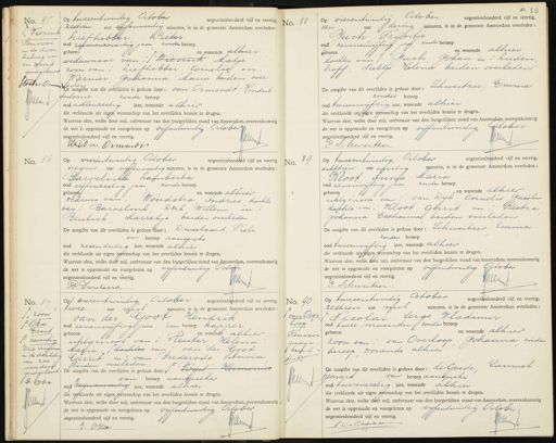 No. 85 „ Vierink Renvooi en de door. haling van een woord goedgekeurd Helten Oemm Welm Op tweeentwintig October negentienhonderd vijf en veertig, zestien uur vijfenveertig minuten, is in de gemeente Amsterdam overleden, Liethebber Pieter oud zevenenzoverstig jaar zonder beroep geboren en wonende alhier C weduwnaar van, / Wiesink Matoe „zoon van, Liethebber Cornelis en Warnier Johanna Maria beiden over De aangste van dit overlijden is gedaan door: van Ormondt Cendiik leden „ Antonie zouder beroep oud achtenzestig jaar, wonende alhier die verklaarde uit eigen wetenschap van het overlijden kennis te dragen. Waarvan akte, welke door mij, ambtenaar van den burgerlijken stand van Amsterdam, overeenkomstig de wet is opgemaakt en voorgelezen op vifentwintig October negentienhonderd vijf en veertig. Wlryf HA m Oimondri No. 86 id 16 Op vierentwintig October negentienhonderd vijf en veertig, een uur dertig minuten, is in de gemeente Amsterdam overleden Gruch Trijntje oud zevenenvijftig jaaf, zonder beroep geboren 80 en wonende alhier dochter van Guch Johan en Luden hoff, Leeltje Velena beiden overleden De aangite van dit overlijden is gedaan door: Schweitzer, Omma zonder beroep oud tweeenvijftig jaar, wonende alhier die verklaarde uisoigen wetenschap van het overlijden kennis te dragen. Waarvan akte, welke door mij, ambtenaar van den burgerlijken stand van Amsterdam, overeenkomstig de wet is opgemaakt en voorgelezen op vijfentwintig ctober negentienhonderd vijf en veertig. I E Schweetter No. 86 Op vierentwintig October negentienhonderd vijf en veertig negen uur vifenveertig minuten, is in de gemeente Amsterdam overleden: Barvelink Lamberta oud vijfenzestig jaar aonde beroep geboren W en wonende alhier weduwe van: Woudstra Andries dochter van Barvelink Derk Willem en Bentick Marretje beiden overleden De aangifte van dit overlijden is gedaan door: Dierlaard, Pieler van beroep aanspieker oud zesendertig jaar, wonende alhier die verklaarde uit eigen wetenschap van het overlijden kennis te dragen. Waarvan akte, welke door mij, ambtenaar van den burgerlijken stand van Amsterdam, overeenkomstig de wet is opgemaakt en voorgelezen op vifentwintig Selofe negentienhonderd vijf en veertig.