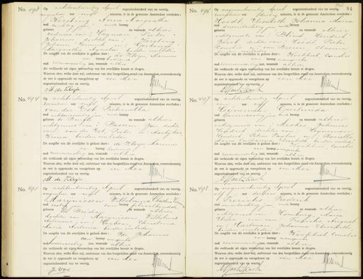 No. 493 op achtentwintig April negentienhonderd vier en veertig, negentien uur mil minuten, is in de gemeente Amsterdam overleden: Kersting Anna Margaretha oud tachtig jaar zonder beroep geboren en wonende alhier weduwe van; Jagman Pieter Johannes dochter van: Kersting Johann Heinrich en: Gerkenn Margaretha Agneta beiden overleden De aangifte van dit overlijden is gedaan door: de Kleyn Marinu van beroep bediende oud zevenenzestig jaar, wonende alhier die verklaarde uit eigen wetenschap van het overlijden kennis te dragen. Waarvan akte, welke door mij, ambtenaar van den burgerlijken stand van Amsterdam, overeenkomstig de wet is opgemaakt en voorgelezen op een Mei negentienhonderd vier en veertig. Jn M de Kleyn No. 496 op negenentwintig Apul negentienhonderd vier en veertig, 84 zeventien uur dertig minuten, is in de gemeente Amsterdam overleden: Hoedt Elisabeth Johanna Maria oud drieentachtig jaar zondde beroep en wonende alhier geboren echtgenoote van: Blind Hendrik Jacob dochter van: Hoedt Pieter Cornelis en: van Beeren, Clasina beiden overleden. De aangfte van dit overlijden is gedaan door: Koekhoek cornelis van beroep aanspreker oud zevenenveertig jaar, wonende alhier die verklaarde uit eigen wetenschap van het overlijden kennis te dragen. Waarvan akte, welke door mij, ambtenaar van den burgerlijken stand van Amsterdam, overeenkomstig de wet is opgemaakt en voorgelezen op een Mei negentienhonderd vier en veertig. Vlns No. 494 op achtentwintig April negentienhonderd vier en veertig, zeventien uur nil minuten, is in de gemeente Amsterdam overleden: van der Est Pieternella oud achtenzeventig jaar zonder beroep geboren te Burger en wonende alhier echtgenoote van: Bessem Jan dochter van: van der Est Pieter en: Moelijker Krina beiden overleden De aangfte van dit overlijden is gedaan door: de Klein Marinus van beroep bediende, oud zevenenzestig jaar, wonende alhier die verklaarde uit eigen wetenschap van het overlijden kennis te dragen. Waarvan akte, welke door mij, ambtenaar van den burgerlijken stand van Amsterdam, overeenkomstig de wet is opgemaakt en voorgelezen op een Mei negentienhonderd vier en veertig. Ji M de Kleijin No. 497 op achtentwintig Apuit negentienhonderd vier en veertig een uur vijf minuten, is in de gemeente Amsterdam overleden Heyneman Geertruida oud tweeenzestig jaar zonder beroep en wonende alhier geboren echtgenoote van: Meskes Johannes Hendrik dochter van: eijneman Hendrik Petrus Paulus en: Rosielle Maria Catharina Elisabeth beiden overlede De aangiste van dit overlijden is gedaan door: Roekhoef Cornelis van beroep aanspreke oud zevenenveertig jaar, wonende alhier die verklaarde uit eigen wetenschap van het overlijden kennis te dragen. Waarvan akte, welke door mij, ambtenaar van den burgerlijken stand van Amsterdam, overeenkomstig de wet is opgemaakt en voorgelezen op een Mei Jlemt negentienhonderd vier en veertig. Hoekkierk No. 495 op achtentwintig April negentienhonderd vier en veertig, negentien uur ml minuten, is in de gemeente Amsterdam overleden: Marijnissen Wilhelmina Christina Eern oud zestig jaar van beroep filiaalhoudste geboren t Breda bn wonende alhier dochter van " Marynissen, Wilhelmus Antonius en: Verben Christina Maria Antonia beiden overleden De aangifte van dit overlijden is gedaan door: Vz Johanines van beroep aangiekel oud tweeenzestig jaar, wonende alhier die verklaarde uit eigen wetenschap van het overlijden kennis te dragen Waarvan akte, welke door mij, ambtenaar van den burgerlijken spand van Amsterdam, overeenkomstig de wet is opgemaakt en voorgelezen op een tei negentienhonderd vier en veertig. Welivg J:„VosNo. 4498 op negenentwintig spul negentienhonderd vier en veertig uur dertien minuten, is in de gemeente Amsterdam overleden elf 6 Frerichs Frederik oud eenentachtig jaar zonder beroep en wonende alhier geboren echtgenoot van: Comburg, Maria Elise zoon van: Frevichs, August en: Hartman Johanna Elisabeth beiden overleden De aangfte van dit overlijden is gedaan door: Koekkoek Cornelis van beroep aanspieke oud zevenenveertigJaar, wonende alhier die verklaarde uit eigen wetenschap van het overlijden kennis te dragen. Waarvan akte, welke door mij, ambtenaar van den burgerlijken stand van Amsterdam, overeenkomstig de wet is opgemaakt en voorgelezen op een Mei Jan negentienhonderd vier en veertig, A Joekkuek