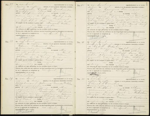 No. 37 op vier April negentienhonderd zes en veertig twintig uur vijftien mindten, is in de gemeente Amsterdam overleden: Oortgisen Gijsberta Geertruida oud tachtig jaar zonder beroep geboren te Medermblik en wonende alhier weduwe van: de hiefde Roelof dochter van Oortgysen Claas Ferdinand en : Wettenbrink Meijer Temmgje beiden overleden De aangite van dit overlijden is gedaan door: Boegem Willen van beroep aanspieke oud drieenvyftig jaar, wonende alhie die verklaarde uit eigen wetenschap van het overlijden kennis te dragen. Waarvan akte, welke door mij, ambtenaar van den burgerlijken stand van Amsterdam, overeenkomstig de weris opgemaaht en voorgelren op — zes April 116 negentienhonderd zes en veertig. Boege No. 40 Op vier April negentienhonderd zes en veertig dertien uur niet minuten, is in de gemeente Amsterdam overleden: Thomas Georguus Franciscus oud tweeentachtig jaar, zonder beroep geboren en wonende alhier weduwnaar van: Ruysmans Marie Gerardina Joanna Christina eerder weduwnaar van: van der Hoef, Helena Maria daarvoor weduwnaar van Ruottenbeld Maria Agatha Susanna zoon van: Thomas Jacobus in Muller Anna Francisca beiden ieder. De Banghte van dt overlijden is gedaan door: van den Braak Adols Frederit van beroep kantoorbediende oud eenentwintig jaar, wonende alhier die verklaarde uit eigen wetenschap van het overlijden kennis te dragen. Waarvan akte, welke door mij, ambtenaar van den burgerlijken stand van Amsterdam, overeenkomstig de wet is opgemaakt en voorgelezen op hls April Jeen negentienhonderd zes en veertig aBraam No. 38 op vijf April negentienhonderd zes en veertig neft uur vijftien minuten, is in de gemeente Amsterdam overleden: Klein Berend Jan oud tweeenzestig jaar, zouder beroep geboren en wonende alhier van echt gescheiden echtgenoot van: Hool werf, Teuntje zoon van: Klein Willem en: de Graaf, Gerdina- beiden overleden De aangifte van dit overlijden is gedaan door: van t Hek sman Francisu van beroep aansieken oud negenen dertig jaar, wonende alhier die verklaarde uit eigen wetenschap van het overlijden kennis te dragen. Waarvan akte, welke door mij, ambtenaar van den burgerlijken stand van Amsterdam, overeenkomstig de wet is opgemaakt en voorgelezen op zes Aprit MW negentienhonderd zes en veertig A v Hek No. 41 op vijf April negentienhonderd zes en veertig drieentwitig uur vijfenviftig ninuten, is in de gemeente Amsterdam overleden: de Rybel Jooephus oud zevenen dertig jaar van beroep bilinoperateur geboren en wonende alhier echtgenoot van: Suebelhoff, Maria Hen„ derika Johanna zoon van: de Rijbel Lammert koopman en Otter, Clasina Johanna zonder beroep beiden wonende alhier De aangfte van dit overlijden is gedaan door: Londag Willem van beroep n cassierde oud dertig jaar, wonende alhier die verklaarde uit eigen wetenschap van het overlijden kennis te dragen. Waarvan akte, welke door mij, ambtenaar van den burgerlijken stand van Amsterdam, overeenkomstig de wet is opgemaakt en voorgelezen op — zes April negentienwonderd zes en veertig. Jun J Adag No. 39 Op vier April negentienhonderd zes en veertig elf uur dertig minuten, is in de gemeente Amsterdam overleden: Loffelman Johannes Bernardus Wilhelmurs bud vierenzeventig jaar zonder beroep geboren te Almelo en wonende alhier echtgenoot van : Abrahumy, Martie weduwnaar van: Ctteman Christina Cornelia zoon van, hoffelman Johannes Wilhelmus en: Warger Angela Maria beiden scblden De Bangitte van dit overlijden is gedaan door: van den Braak Adolf Frederit van beroep kantoorbediende. oud eenentwintig jaar, wonende alhier die verklaarde uit eigen wetenschap van het overlijden kennis te dragen. Waarvan akte, welke door mij, ambtenaar van den burgerlijken stand van Amsterdam, overeenkomstig de wet is opgemaakt en voorgelezen op zis Aprit negentienhonderd zes, en veertig MG AV dBeant No. 42 op vier April negentienhonderd zes en veertig vijftien uur vijftien minuten, is in de gemeente Amsterdam overleden: Smal Cornelis oud vierentachtig jaar zondder beroep geboren te Berkhout en wonende alhier 57 weduwnaar van: Roben, Rijntje zoon van: Smal Jacob en: Veldboer Marijtje beiden overleden De aangifte van dit overlijden is gedaan door: Emmerik, Catharina noude beroep oud vijfentwintig jaar, wonende alhier die verklaarde uit eigen wetenschap van het overlijden kennis te dragen. Waarvan akte, welke door mij, ambtenaar van den burgerlijken stand van Amsterdam, overeenkomstig de wet is opgemaakt en voorgelezen op zes Aprit negentienhonderd zes en veertig C Emmerik