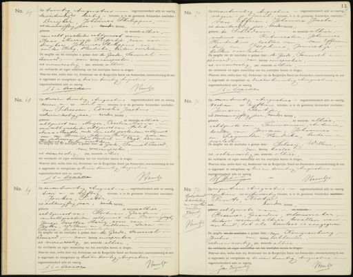 No. 67. Op twintig Augustus negentienhonderd acht en veertig drieen twintig bur dertig - minuten, is in de gemeente Amsterdam overleden: Duijker Johannes Philippus, oud eenenvijftig jaar, zonder beroep, geboren en wonende alhier van echt gescheiden echtgenoot van Baas Marrigje Pietertje, zoon van: Duijker Johannes Philippus en van den Berg, Hendrika, beiden overleden De aangifte van dit overlijden is gedaan door: de Goede, Samuel Leonari, van beroep aanspreker oud vierenzestig- Jaar, wonende alhier die verklaarde uit eigen wetenschap van het overlijden kennis te dragen. Waarvan akte, welke door mij, Ambtenaar van de Burgerlijke Stand van Amsterdam, overeenkomstig de wet is opgewaakt en voorgelezen op drie en twintig Augustusnegentienhonderd acht en veertig A: C: - lvcse Naantes No. 70 eenentwintig Augustus negentienhonderd acht en veertig, negen - ur nnul- minuten, is in de gemeente Amsterdam overleden: van Efferen, Johanna Jacoba, oud eenentachtig jaar, zonder beroep, geboren te Schiedam, en wonende alhier, weduwe van: Ritmeester, Johannes Hendrikus dochter van: van Efferen, Arij en Osephius Jannetje beiden overleden De aangifte van dit overlijden is gedaan door: de Goede, SanuuelLeonard van beroep aanspreker oud vierenzestig jaar, wonende alsier die verklaarde uit eigen wetenschap van het overlijden kennis te dragen. Waarvan akte, welke door mij, Ambtenaar van de Burgerlijke Stand van Amsterdam, overeenkomstig de weis opgemaakt en voorgelezen op drie en twintig Augustusnegentienhonderd acht en veertig 1.6 - loeden No. 68 Optwee en twintig Augustus negentienhonderd acht en veertig teven uur net minuten, is in de gemeente Amsterdam overleden: van Schreeven, Cornelis Jacobus oud drie en zestig jaar, zonder beroep, geboren en wonende alhier, echtgenoot van: Meijer, Cecilia Maria van echt gescheiden echtgenoot van: Palck Anna Martha, eerder van echt gescheiden echtgenoot van: van Bercum, Johanna Philippina zoon van van schreeven Jhan Hendrik en: Vogt, LouiseFrederica beiden overleden De aangite van Dt overlijden is gedaan door: de Goede, Samual Lemard van beroep aanspreker oud vierntestig jaar, wonende allier die verklaarde uit eigen wetenschap van het overlijden kennis te dragen. Waarvan akte, welke door mij, Ambtenaar van de Burgerlijke Stand van Amsterdam, overeenkomstig de wet is opgemaakt en voorgelezen op drie en twintig Augustus negentienhonderd acht en veertig v. te lwede Haanke No. 71 op eenentwintig Augustus negentienhonderd acht en veertig, zestien uur vijftien windten, is in de gemeente Amsterdam overleden: Jansen, Leentje oud zevenenvijftig jaar, zonder beroep, 0 en wonende alhier geboren echtgenote van: Timmerman, Antoniedochter van: Jansen, Johannes en Siegmulder, Hendrika, beiden. overleden De zangite van dt overlijden is gedaan door: Schaaij, Willem, van beroep kooter oud achtenveertig jaar, wonende alhier die verklaarde uit eigen wetenschap van het overlijden kennis te dragen. Waarvan akte, welke door mij, Ambtenaar van de Burgerlijke Stand van Amsterdam, overeenkomstig de wet is opgemaakt en voorgelezen op drie en twintig Augustus negentienhonderd acht en veertig. WOrt Waantjs No. 69 op eenentwintig Augustus — negentienhonderd acht en veertig tien uur vijftig minuten, is in de gemeente Amsterdam overleden: Jonker, Pieter oud achtenvyftig jaar, zonder beroep, geboren en wonende alhier echtgenoot van: Hootman, Geertrui van echtgescheiden echtgenoot van Cronjwyk, Jansje Dorothea Maria zoon van Jomber, Willem en: Endhoven, Sara Maria, beiden overleden De aangite van dit overlijden is gedaan door: de Goede, SamuelLenard, van beroep amspriker oud vierenzestig jaar, wonende alhier die verklaarde uit eigen wetenschap van het overlijden kennis te dragen. Waarvan akte, welke door mij, Ambtenaar van de Burgerlijke Stand van Amsterdam, overeenkomstig de wet is opgewaakt en voorgelezen op drie en twintig Augustus Mantjer negentienhonderd acht en veertig A. t - Cweal No. 72 Goetgekeurd de doorhaling van negentien woorden J Hoopserb 6 Staantes negentien Augustus negentienhonderd acht en veertig, negentien uur vijfenveertig minuten, is in de gemeente Amsterdam overteden: Pinto Naatje Zen zonder beroep geboren echtgenote van en wonende Besemer, Gerardus, schoenmaker beiden wonende alhier bevallen van eenbind, dat als levenloos is aangegeven De aangtte van di overlijden is gedaan door van Konijnenburg, Jacobus, van beroep boekhouder oud drie en veertig jaar, wonende alhier Sie verklaarde uit eigen wetenschap van het overtijden kennis te drogen. Waarvan akte, welke door mij, Ambtenaar van de Burgerlijke Stand van Amsterdam, overeenkomstig de wet is opgemaakt en voorgelezen op drieen twintig Augustus negentienhonderd acht en veertig Haank Jan Houjnenbe
