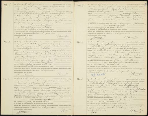 No. 1 Op twaalf Augustus negentienhonderd acht en veertig regen uu dertig - minuten, is in de gemeente Amsterdam overleden: de Moor, Kathijs Jan oud zeventig jaar, van beroep secretaris van een vereniging, D geboren te Drongelenthans rethen, en wonende allier, echtgenoot van: Hakstege, Maria, zoon van: de Moor, Cornelis en Heijkoop, Aartje, beiden overleden De aangifte van dit overlijden is gedaan door: van Loo, Pieter van deroep chanffeur oud achtenvijftig jaar, wonende alhier die verklaarde uit eigen wetenschap van het overlijden kennis te dragen. Waarvan akte, welke door mij, Ambtenaar van de Burgerlijke Stand van Amsterdam, overeenkomstig de wet is opgewaakt en voorgelezen op dertien Augustus negentienhonderd acht en veertig Haanken B. L d No. 4 op twaalf Augustus negentienhonderd acht en veertig, zestien uur vijftien minuren, is in de gemeente Amsterdam overleden: Vermeulen, Jacoba Carolina oud tweeën tachtig jaar, zonder beroep, geboren en wonende alhier weduwe van: Heijne, Hendrik, dochter van: Vermeulen, Gerrit en Geus Johanna Cornelia, beiden overleden Aade tn dtatanen Sietan dor: van Anarongen, Jolames van beroep aanspreker oud vierenvijftig jaar, wonende alhier die verklaarde uit eigen wetenschap van het overlijden kennis te dragen. Waarvan akte, welke door mij, Ambtenaar van de Burgerlijke Stand van Amsterdam, overeenkomstig de wet is opgemaakt en voorgelezen op dertien Augustus negentienhonderd acht en veertig. Haantes Jvan No. 2 op elf Augustus negentienhonderd acht en veertig, negen- uur dertig - minuten, is in de gemeente Amsterdam overleden: de Langen, Maria Jacoba Cornelia; oud vierentachtig jaar, zonder beroep geboren en wonende alhier van Echt gescheiden echtgenote van Camphius, Hendrik Bate dochter. van: de Langen, Jan, en Frederiks, Cornelia, beiden overleden De aangite van dit overlijden is gedaan door: van Koo, Pieter van beroep chariffeur oud achtenvijftig Jaar, wonende alhier die verklaarde uit eigen wetenschap van het overlijden kennis te dragen. Waarvan akte, welke door mij, Ambtenaar van de Burgerlijke Stand van Amsterdam, overeenkomstig de wet is opgemaakt en voorgelezen op dertien Augustus negentienhonderd acht en veertig. Staanten Z L vo No. 5 Op twaalf Augustus negentienhonderd acht en veertig, twintig - uur vijfenveertig minuten, is in de gemeente Amsterdam overleden Mellema, Jan Aiold, oud tweeen vijftig jaar, van beroep kopersloger geboren te Maarssen, en wonende alhier, echtgenoot van: Torster Anna zoon van: Mellema, Berend en: Mulder, Doetje, beiden overleden De zangite van dt overlijden is gedaan door: Over, Willem van beroep begrafenis ondernemer, oud achtenzestig jaar, wonende alhier die verklaarde uit eigen wetenschap van het overlijden kennis te dragen. Waarvan akte, welke door mij, Ambtenaar van de Burgerlijke Stand van Amsterdam, overeenkomstig de wet is opgewaakt en voorgelezen op dertien Augustus negentienhonderd acht en veertig. Haartes Woold No. 3. Op twaalf Augustus negentienhonderd acht en veertig, negen- ur nul- minuten, is in de gemeente Amsterdam overleden: Smit, Alyda Susanna, oud zesenzestig jaar, zonder beroep geboren en wonende alhier echtgenoote van: Bouquet, Wilhelmus, weduwe van Bosma, Ruurd, eerder weduwe van: Bruinewoud, Jan, daarvoor van echt gescheiden echtgenote van: Loevens, Bartholomeus Christianus dochter van: Smit, Gijsbertus en: Proger lecilia Catharina, beiden overleden De aangifte van dit overlijden is gedaan door: van Amerongen, Johannes, van beroep aanspreker. oud vierenvijftig jaar, wonende alhier die verklaarde uit eigen wetenschap van het overlijden kennis te dragen. Waarvan akte, welke door mij, Ambtenaar van de Burgerlijke Stand van Amsterdam, overeenkomstig de wet is opgemaakt en voorgelezen op dertien Augustus negentienhonderd acht en veertig. Saantjr Jubr No. 6 op dertien Augustus negentienhonderd acht en veertig twintig uur vijftien mindten, is in de gemeente Amsterdam overleden: Renbeek, Josephus Antonius oud eenenvijftig jaar, van beroep briffeschef geboren en wonende alhier echtgenoot van: Bouwmeester Elisabeth Clasina, zoon van: Kenbeek, Johannes en Haunsen, Maria Johanna, beiden overleden. De aangtte van dt overlijden is gedaan door: Vos, Nicolaas, van beroep anopreker oud vierenzestig Jaar, wonende alhier die verklaarde uit eigen wetenschap van het overlijden kennis te dragen. Waarvan akte, welke door mij, Ambtenaar van de Burgerlijke Stand van Amsterdam, overeenkomstig de wet is opgemaakt en voorgelezen op veertien Augustus negentienhonderd acht en veertig. Branter Nv 19/