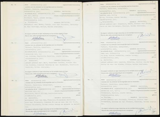 No. 16 Heden achtentwintig juli negentienhonderd zevenenzestig; verscheen voor mij, ambtenaar van de burgerlijke stand van Amsterdam: Verhaar, Hendrik, chauffeur, oud achtenvijftig jaar, wonende te Amsterdam, die verklaarde, dat op zevenentwintig juli negentienhonderd zevenenzestig te een uur, dertig minuten, in de gemeente Amsterdam is overleden Noordhof, Geert, zonder beroep, oud geboren vierenzeventig jaar, te Slochteren, wonende te Amsterdam, echtgenoot van: Wever, Jansje, zoon van: Noordhof, Gerhardus en van: Korringa, Aaltje, beiden overleden. De aangever verklaarde uit eigen wetenschap van het overlijden kennis te dragen. Waarvan akte, welke overeenkomstig de wet is voorgelezen. dun Werhaan No. 19 Heden eenendertig juli negentienhonderd zevenenzestig verscheen voor mij, ambtenaar van de burgerlijke stand van Amsterdam: Verhaar, Hendrikus, aanspreker, oud achtenvijftig jaar, wonende te Amsterdam, die verklaarde, dat op achtentwintig juli negentienhonderd zevenenzestig t zestien uur, dertig minuten, in de gemeente Amsterdam is overleden Kroon, Grietje, zonder beroep, oud tweeëntachtig jaar, geboren te Monnikendam, wonende te Amsterdam, gehuwd geweest met: Steenhuis, Rense, dochter van: Kroon, Jacob en van: Kelderman, Neeltje, beiden överleden. De aangever verklaarde uit eigen wetenschap van het overlijden kennis te dragen. Waarvan akte, welke overeenkomstig de wet is voorgelezen. JA. Saein 8 WElerhaan No. 17 Heden achtentwintig juli negentienhonderd zevenenzestig; verscheen voor mij, ambtenaar van de burgerlijke stand van Amsterdam: Verhaar, Hendrik, chauffeur, oud achtenvijftig jaar, wonende te Amsterdam, die verklaarde, dat op zevenentwintig juli negentienhonderd zevenenzestig te zeventien uur, nul minuten, in de gemeente Amsterdam is overleden: van Oosbree, Geertruida Hendrika, zonder beroep, oud geboren achtenzeventig jaar, te Enkhuizen, wonende te Enkhuizen, gehuwd geweest met: Smit, Hendrikus Jacobus, dochter van: van Oosbree, Johannes Hendrik en van: Barendsen, Geertruida Hendrika, beiden overleden. De aangever verklaarde uit eigen wetenschap van het overlijden kennis te dragen. Waarvan akte, welke overeenkomstig de wet is voorgelezen 1aas WHerhaan No. 20 Heden eenendertig juli negentienhonderd zevenenzestig verscheen voor mij, ambtenaar van de burgerlijke stand van Amsterdam: Verhaar, Hendrikus, aanspreker, 000 achtenvijftig jaar, wonende te Amsterdam, die verklaarde, dat op achtentwintig juli negentienhonderd zevenenzestig te twee uur, vijfendertig minuten, in de gemeente Amsterdam is overleden de Hoog, Aleida Catharina, zonder beroep, oud geboren drieënzeventig jaar, te Amsterdam, wonende te Amsterdam, gehuwd geweest met: Leurink, Elbertus, dochter van: de Hoog, Petrus en van: van Alphen, Dirkje, beiden overleden. De aangever verklaarde uit eigen wetenschap van het overlijden kennis te dragen. J A Sreig Waarvan akte, welke overeenkomstig de wet is voorgelezen. WElerhaan No. 18 Heden eenendertig juli negentienhonderd zevenenzestig verscheen voor mij, ambtenaar van de burgerlijke stand van Amsterdam: Verhaar, Hendrikus, aanspreker, o00 achtenvijftig jaar, wonende te Amsterdam, die verklaarde, dat op negenentwintig juli negentienhonderd zevenenzestig te veertien uur, nul minuten, in de gemeente Amsterdam is overleden Krielaart, Gerrit Willem, kantoorbediende, oud geboren drieenzestig jaar, te Amsterdam, wonende te Amsterdam, echtgenoot van: van Dam, Francisca Wilhelmina Charlotta. zoon van: Krielaart, Johannes Willem en van: van der Vliet, Johanna Elisabeth, beiden zonder beroep en wonende te Amsterdam. De aangever verklaarde uit eigen wetenschap van het overlijden kennis te dragen. Cssr Waarvan akte, welke overeenkomstig de wet is voorgelezen. WHerhaan No. 21 Heden eenendertig juli negentienhonderd zevenenzestig verscheen voor mij, ambtenaar van de burgerlijke stand van Amsterdam: Verhaar, Hendrikus, aanspreker, on achtenvijftig jaar, wonende te Amsterdam, die verklaarde, dat op negenentwintig juli negentienhonderd zevenenzestig t zeventien uur, vijftig minuten, in de gemeente Amsterdam is overleden Groeneveld, Susanna, zonder beroep, oud negenentachtig jaar, geboren te Haarlem, wonende te Amsterdam, gehuwd geweest met: Portegijs, Cornelis, dochter van: Groeneveld, Abraham en van: Winters, Hendrika, beiden overleden. De aangever verklaarde uit eigen wetenschap van het overlijden kennis te dragen. Asoo Waarvan akte, welke overeenkomstig de wet is voorgelezen. WHerhaan