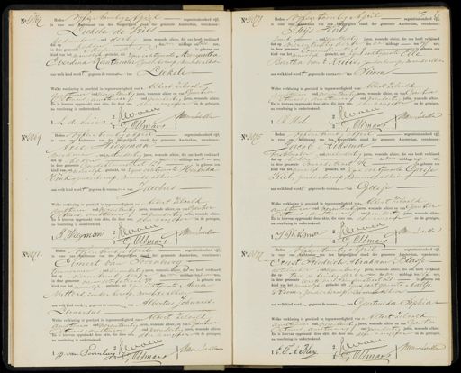 No. 1873 Heden vijfentwintig April negentienhonderd wij is voor ons Ambtenaar van den burgerlijken stand der gemeente Amsterdam, verschenen: Thijs Wals somid, oud zesentwintig jaren, wonende alhier, die ons heeft verklaard dat op vierentwintig dezer des na middags ten vijf ure, in deze gemeente Commelinstraat9is geboren een kind van het mannelijk geslacht, uit zijne echtgenoote Elle Bartha van ’t Kruis, zonder beroep, wonende ilhier aan welk kind wordt gegeven de voornaam van Siimon Welke verklaring is geschied in tegenwoordigheid van Albert Zilvold ambtenaar oud vierentwintig Jaren, wonende alhier, en van Gautier Oltmans ambtenaar oud zesendertig jaren, wonende alhier En is hiervan opgemaakt deze akte, die door ons, den aangever en de getuigen, na voorlezing is onderteekend. ve Nkenrgéchalla Th: Wals 3C Oltmans No 1869 Heden vifentwintig April negentienhonderd vi is voor ons Ambtenaar van den burgerlijken stand der gemeente Amsterdam, verschenen trie Wiegman werkman, oud achtendertig jaren, wonende alhier, die ons heeft verklaard dat op heden des voormiddags ten een ure, in deze gemeente Goudsbloemstraat 12 is geboren een kind van het mannelijk geslacht, uit zijne echtgenoote Hendrika Vink zonderberoep, wonende alhier. aan welk kind wordt gegeven de voornaam van Jacobus Welke verklaring is geschied in tegenwoordigheid van Albert Zilvold ambtenaar oud vierentwintig jaren, wonende alhier, en van Gautier Oltmans, ambtenaar oud zesendertig jaren, wonende alhier En is hiervan opgemaakt deze akte, die door ons, gen aangever en de getuigen, na voorlezing is onderteekend. N Valeenngéchala A Wiegman C Oltmars No 4873 Heden vijfentwintig April negentienhonderd wijf is voor ons Ambtenaar van den burgerlijken stand der gemeente Amsterdam, verschenen Jacob Riksma borstelmaker, oud achtendertig jaren, wonende alhier, die ons heeft verklaard dat op heden des voor middags ten zeven ure, in deze gemeente Conradstraat 4 is geboren een kind van het vrouwelijk geslacht, uit zijne echtgenoote Geesje Kiel, zonder beroep, wonende alhier aan welk kind wordt gegeven de voornaam van Geesje Welke verklaring is geschied in tegenwoordigheid van Albert Zilools ambtenaar oud vierentwintig jaren, wonende alhier en van Gautier Oetmans ambtenaar oud zesendertig jaren, wonende alhier En is hiervan opgemaakt deze akte, die door ons, den aangever en de getuigen na voorlezing is onderteekend. Le Nuenrischalla J Pikmd 2 pl 3G Oltmars No 1871. Heden Vijfentrintig April negentienhonderd wijf is voor ons Ambtenaar van den burgerlijken stand der gemeente Amsterdam, verschenen Amert van Voornburg timmerman, oud eenendertig jaren, wonende anhier, die ons heeft verklaard dat op vierentwintig dezer des voor middags ten zeven ure, in deze gemeente van Woustraat 77 is geboren een kind van het mannelijk geslacht, uit zijne echtgenoote Anna Nutters, zonder beroep, wonende alhier aan welk kind worden gegeven de voornamen van Albertus Johannes. Lonardus Welk verkaring is geschied in tegenwoordgheid van Albert Zilvold Ambtenaar oud vierentwintig jaren, wonende alhier, en van Gautier Oltmans ambtenaar oud zsendertig jaren, wonende alhier. En is hiervan opgemaakt deze akte, die door ons, den aangever en de getuigen, na voorlezing is onderteekend. N J: van Poornhurg Olsman enveellan No 4877 Heden vijfentwintig April negentienhonderd wijf is voor ons Ambtenaar van den burgerlijken stand der gemeente Amsterdam, vegschenen, Ernst Friedrich Abraham Blasse Ketelmaker, oud negenentwintig jaren, wonende alhier, die ons heeft verklaard dat op twee en twintig dezer des na middags ten elf ure, in deze gemeente eerste van Srindenstraat 21 is geboren een kind van het vrouwelijk geslacht, uit zijne echtgenoote Aaltje Room, zonder beroep, wonende alhier- aan welk kind worden gegeven de voornamen van Geertruida Sophia- Welke verklaring is geschied in tegenwoordigheid van Albert Zilvold ambtenaar oud vierentwintig jaren, wonende alhier en van Gautier Oltmans ambtenaar oud zesendertig jaren, wonende alhier En is hiervan opgemaakt deze akte, die door ons, den aanjever en de getuigen na voorlezing is onderteekend.