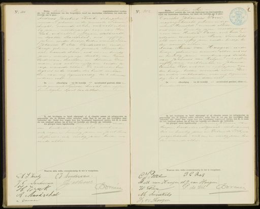 No. 301 Heden dertien Mei negentienhonderd veertien zijn voor mij Ambtenaar van den burgerlijken stand van Amsterdam verschenen, ten einde een huwelijk aan te gaan: Andreas Jacobus Krak, scheepstim merman, geboren in de gemeente Nieuwer- Amstel, wonende alhier, oud acht entwin tig jaren, meerderjarige zoon van Hein Krak, oud acht en vijftig jaren, stalknecht en Agatha Maréschal, oud vijftig jaren, zonder beroep, beiden wonende alhier en Johanna Eilia Sondervan, zonder beroep, geboren in de gemeente Nieuwer.Am stel, wonende alhier, oud vier en twintig jaren, meerderjarige dochter van Teunis Sondervan, overleden en Adriana Dam man, oud acht en vijftig jaren, zonder be„ roep, wonende alhier. De ouders des brui degoms en de moeder der bruid verklaar den, voor mij tegenwoordig, toe te stemmen in dezen echt. De afkondiging — tot dit huwelijk is onverhinderd geschied, alhier en in de gemeente Nieuwer. Amstel, den vijf en twintigsten April laatstleden. Ik heb bruidegom en bruid afgevraagd of zij elkander nemen tot echtgenooten en getrouwelijk alle de plichten zullen vervullen, welke door de wet aan den huwelijken staat verbonden zijn. Nadat deze vragen door hen bevestigend beantwoord werden, heb ik, in naam der wet, uitspraak gedaan, dat zij door het huwelijk aan elkander zijn verbonden. Als getuigen waren tegenwoordig: Cornelis Johannes zonder van, broeder der echtgenoote, werkman oud negen en twintig jaren en Jacob Meurs stoffeerder, oud veertig jaren, beiden wo- nende alhier Waarvan akte, welke overeenkomstig de wet is voorgelezen. No. 302. Heden dertien Mei negentienhonderd veertien zijn voor mij Ambtenaar van den burgerlijken stand van Amsterdam verschenen, ten einde een huwelijk aan te gaan: Cornelis Johannes Porre magazijnknecht, geboren in de ge meente Heemstede, wonende alhier, oud vier en twintig jaren, meerderjarige zoon van Hendrik Porré, oud twee en zestig jaren, concierge en Maria Swinkels, oud vier en vijftig jaren, zonder beroep, bei den wonende alhier en Anna Maria van Haagen, zonder beroep, geboren en wonende alhier, oud zes en twintig jaren, meerderjarige dochter van Johannes van Haagen, oud acht en vijftig jaren, nachtwaker en Johanna Cornelia Ros, oud drie en vijftig jaren, zon der beroep, beiden wonende alhier Bei- der ouders verklaarden, voor mij tegenwoor dig, toe te stemmen in dezen echt De afkondiging — tot dit huwelijk is onverhinderd geschied, alhier den tweeden dezer Ik heb bruidegom en bruid afgevraagd of zij elkander nemen tot echtgenooten en getrouwelijk alle de plichten zullen vervullen, welke door de wet aan den huwelijken staa verbonden zijn. Nadat deze vragen door hen bevestigend beantwoord werden, heb ik, in naam der wet, uitspraak gedaan, dat zij door het huwelijk aan elkander zijn verbonden Als getuigen waren tegenwoordig: Antonius Johannes van Haagen, broeder der echtgenoote, werkman, oud drie en twintig jaren en Petrus de Wit, ma gazijnbediende, oud een en veertig jaren, bei den wonende alhier Waarvan akte, welke overeenkomstig de wet is voorgelezen. AI Krak CJ Hondervan- .. . . . . . . a/ C Sondervan Petbems 9 J. Brevee H Krak A Maregehal a Hanman JC Rot C J Poorl A: M. van Haagen A.J. van Haagen P: de Wil Brevee J Porie M Swinkels J vd Haagen