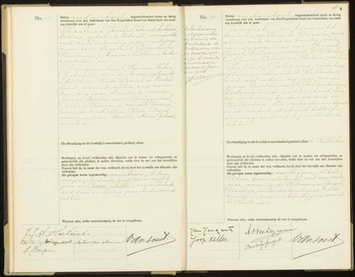 No. 13. Heden veertien April negentienhonderd zeven en dertig verschenen voor mij, Ambtenaar van den Burgerlijken Stand van Amsterdam, ten einde een huwelijk aan te gaan: Hastrich Jacobus Johannes Anthonius kellner, geboren te Utrecht wonende alhier oud acht en twintig jaar meerderjarige „ zoon van: Hastrich, Gerardus en Poulissen Maria Anthonia beiden overleden en Bruggenhorst Hermine Helene Gertrand zonder beroep, geboren te Mülherm Kuhr Broich in Duitsch land, wonende alhier, oud zes en twintig jaar, Duitsche meerder. jarige dochter van: Bruggenhorst Johann Hermann zonder beroep. wonende te Mülheim Kuhr Broich voornoemd en Werkle, Maria Gertrand overleden. De afkondiging tot dit huwelijk is onverhinderd geschied, alhier, Bruidegom en bruid verklaarden mij, elkander aan te nemen tot echtgenooten en getrouwelijk alle plichten te zullen vervullen, welke door de wet aan den huwelijken staat zijn verbonden. Daarop heb ik, in naam der wet, verklaard, dat zij door het huwelijk aan elkander zijn verbonden. Als getuigen waren tegenwoordig: van Assen, Anton magazijnbediende, oud zes en vijftig jaar en Jasper, Sible, magazijnbeziende, oud twee en dertig jaar, beiden wonende alhier. Waarvan akte, welke overeenkomstig de wet is voorgelezen. No. 14 Echtscheiding uitgeophoken ij muis der Leektbank t lotterdam van 22 October 1945. in geschreven e Amsterdam. heden 21 Janu uri 1946 Wetuw vl. Heden veertien April negentienhonderd zeven en dertig verschenen voor mij, Ambtenaar van den Burgerlijken Stand van Amsterdam, ten einde een huwelijk aan te gaan: Jongert, Jan leeraar in het teekenen, geboren te Beemster wonende alhier, oud zeven en twintig jaar, meerderjarige zoon van: Jongert Jacob, leeraar wonende te Rotterdam en Geerke, Catharina Helena overleden en Keller Johanna zonder beroep geboren en wonende te Rotterdam, oud vijf en twintig jaar meerder. jarige dochter van: Keller Adriaan kantoorbediende en Lockhorst, Lena zonder beroep, beiden wonende te Rotterdam. De vader des bruidegam. en de ouders der bruid hebben toe stemming verleend bij authentieke akten. De afkondiging tot dit huwelijk is onverhinderd geschied, alhier te Rotterdam Bruidegom en bruid verklaarden mij, elkander aan te nemen tot echtgenooten en getrouwelijk alle plichten te zullen vervullen, welke door de wet aan den huwelijken staat zijn verbonden. Daarop heb ik, in naam der wet, verklaard, dat zij door het huwelijk aan elkander zijn verbonden. Als getuigen waren tegenwoordig: vonr seggern, Albertus Petrus, procuratiehouder, oud zes en zestig jaar, wonende te Hilversum en Jongert Beatrys zuster des bruidegoms zonder beroep, oud een en twintig jaar, wonende te Rotterdam. Waarvan akte, welke overeenkomstig de wet is voorgelezen. J. J.J. Hastriel. van soest. BB: E Bruigenhorst Inton van een S. Jasper Jan Jonqut AtTonLererg Peeden Vansoest. Joop Keller