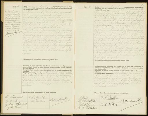 No. 4 Echtscheiding uitgeproken bij vonnis al Rechtbank te Amsterdam van 31 Januari 1946, iigeschre¬ ven te Amter dam heden 13 April 1946 Weetw Heden zeven April negentienhonderd zeven en dertig verschenen voor mij, Ambtenaar van den Burgerlijken Stand van Amsterdam, ten einde een huwelijk aan te gaan: Munnik, Bertus ijzerwerker geboren en wonende alhier oud een en twintig jaar, meerderjarige zoon van: Munnik Dirk Wilhelm „ Frederik, overleden en ten Heuvel Jentje, oud acht en vijftig jaar, zonder 6 beroep, wonende alhier en de Noo Gerritje zonder beroep, geboren en wonende alhier oud twintig jaar, minderjarige dochter van: de Roo, Johannes oud acht en vijftig jaar, zonder beroep wonende alhier en van Oort Johanna over leden. De moeder Zes bruidegoms en de vader der bruid verklaarden mij toestemming tot dit huwelijk te Geven. De afkondiging tot dit huwelijk is onverhinderd geschied, alhier. Bruidegom en bruid verklaarden mij, elkander aan te nemen tot echtgenooten en getrouwelijk alle plichten te zullen vervullen, welke door de wet aan den huwelijken staat zijn verbonden. Daarop heb ik, in naam der wet, verklaard, dat zij door het huwelijk aan elkander zijn verbonden. Ais getuigen waren tegenwoordig: Munnik Dirk Wilhelm broeder des bruidegoms, werkman oud acht en dertig jaar en de Roo Willem, broeder der bruid chauffeur¬ oud drie en dertig jaar, beiden wonende alhier. Waarvan akte, welke overeenkomstig de wet is voorgelezen. No. 5. 14 Heden zeven April negentienhonderd zeven en dertig verschenen voor mij, Ambtenaar van den Burgerlijken Stand van Amsterdam, ten einde een huwelijk aan te gaan: Bakker, Johannes Cerardus Hendrikus buffetchef geboren te 's Gravenhage wonende alhier, oud een en dertig jaar, van echt gescheiden echtgenoot van: van der Heiden, Maartje meerderjarige zoon van: Bakker, Franciscus Johannes Hendrikus, kellner, wonende te 's Gravenhage en Jansen, Adriana Geertruida, overleden en Felix Antje Geertruida Henderika zonder beroep, geboren en wonende alhier oud twee en twintig jaar meerderjarige dochter van: Felix Hendricus Fredericus oud acht en veertig jaar, - werkman en Kokkes, Geertruida Henderika oud vyf en veertig jaar, zonder beroep, beiden wonende alhier. De ouders der bruid verklaarden mij toestemming tot dit huwelijk te geven De afkondiging tot dit huwelijk is onverhinderd geschied, alhier. Bruidegom en bruid verklaarden mij, elkander aan te nemen tot echtgenooten en getrouwelijk alle plichten te zullen vervullen, welke door de wet aan den huwelijken staat zijn verbonden. Daarop heb ik, in naam der wet, verklaard, dat zij door het huwelijk aan elkander zijn verbonden. Als getuigen waren tegenwoordig: Bakker Franciscus Antonius broeder des bruidegoms kleermaker oud zes en dertig jaar en Vetter, Octo Alfred schilder oud drie en vijftig jaar beiden wonende alhier. Waarvan akte, welke overeenkomstig de wet is voorgele B. Munrick D: W: Munnck van soest. G. de Roo W de Roo J Een Heuvel J de Koo J Bakker F. A. Bakke Van Soest A GH Bakbfelir H Velier O. A. Vetter J H Kokkes