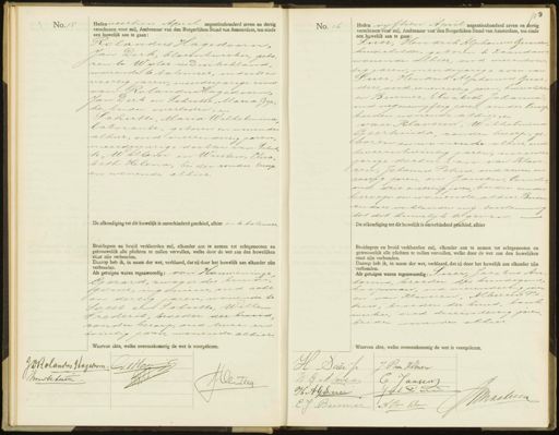 No.15 Hedenveeltien Apri negentienhonderd zeven en dertig verschenen voor mij, Ambtenaar van den Burgerlijken Stand van Amsterdam, ten einde een huwelijk aan te gaan: Rolandus Hagedoorn Jan Derk, bloemkweeker, geboren te Wijler in Duitschland wonende te talsmeer, ondacht en veertig jaren, meerderjarige zoon van: Rolandus Hagedoom, Jan Derk in Schuitte, Maria Gep, ke, beiden overleden, en Schutte, Maria Wilhelmima laborante, geboren en wonende alhier, oud vierendertig jaren, meeiderjarige dochter van Schutte, Willem en Wusten, Elisabeth Helena, beiden zonder beroep en wonende alhier De afkondiging tot dit huwelijk is onverhinderd geschied, alhier en te salemeer Bruidegom en bruid verklaarden mij, elkander aan te nemen tot echtgenooten en getrouwelijk alle plichten te zullen vervullen, welke door de wet aan den huwelijken staat zijn verbonden. Daarop heb ik, in naam der wet, verklaard, dat zij door het huwelijk aan elkander zijn verbonden. Als getuigen waren tegenwoordig: van Rouweninge Gerard, zwager des brundig goms, ingenieur, oud acht en dertig jaren, wonende te Loest en Schuitte, Willem Frederik, broeder der bruid zonder beroep, oud twee en tintig jaren, wonende alhier No. 16 Heden vijftien Annil negentienhonderd zeven en dertig verschenen voor mij, Ambtenaar van den Burgerlijken Stand van Amsterdam, ten einde een huwelijk aan te gaan: Juer, Hendrik Alphonsus Gerardus huisschilder, geboren te Zaandan wonende alhier, oud vierentwin tig jaren, meerderjarige zoon van Puer, Hendrik Alphonius Gerardus, oud eenenzestig jaren, huisschilder en Beumer, Elisabeth Johanna oud negenenvijftig jaren, zonder beroep beiden wonende alhier, en van Klaveren, Wilhelming Geertruida, zonder beroep, geboren en wonende alhier, oud tweeentwintig jaren, meerder jarige dochter van: van Klaveren, Johannes Petri, oud zeven en zestig jaren, en Jansen, Cornelis oud drie enzestig jaren beiden zonder beroep en wonende alhier, Beider ouders verklaarden mij toesten tot dit huwelijk te geven. De afkondiging tot dit huwelijk is onverhinderd geschied, alhier Bruidegom en bruid verklaarden mij, elkander aan te nemen tot echtgenooten en getrouwelijk alle plichten te zullen vervullen, welke door de wet aan den huwelijken staat zijn verbonden. Daarop heb ik, in naam der wet, verklaard, dat zij door het huwelijk aan elkander zijn verbonden. dls getuigen waren tegenwoordig: Suer, Jacobus An tonuss, broeder des brundegoms, koopman, oud vierendertig jaren en van Klaveren, Alberuus Pe trus, broeder der bruid, bankwerker, oud drieen tertig jaren, beiden wonende alhier. Waarvan akte, welke overeenkomstig JVHolandus Hagedom J. J. Hou Mrrsehui Jerteg J P van Jlurer H. Duerz WG vK Laveren E Jansen Joek CS H AGSuu Jmaateeen E J Beumer A Pva Klan