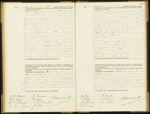 No. 77 Heden twaalf Mei negentienhonderd zeven en dertig verschenen voor mij, Ambtenaar van den Burgerlijken Stand van Amsterdam, ten einde een huwelijk aan te gaan: Hoedt, Johannes Hendrik winkelier, geboren en wonende alhier, oud eenentwintig ja„ een meeiderjatige voor van: Hoedt, Piet Cornelis, oud drie enveertig jaren, winkelier en van Dam, Cornelia Maria, oud eenenveertig jaren zonder beroep, beiden wonende alhier, en van Vuure, Hendrika zonder beroep, geboren en wonen de alhiet, oud eenentwintig jaren, meeiderjarige dochier van: van Vure, Jacob. oud zevenen veertig jaren, transport arbeider en Paber, Hendrika oud drieënveertig jaren, zonder beroep berden wonende alhier, Buder ouders verklaarden mij tester ming tot dit huwelijk te geven. De afkondiging tot dit huwelijk is onverhinderd geschied, alhier Bruidegom en bruid verklaarden mij, elkander aan te nemen tot echtgenooten en getrouwelijk alle plichten te zullen vervullen, welke door de wet aan den huwelijken staat zijn verbonden. Daarop heb ik, in naam der wet, verklaard, dat zij door het huwelijk aan elkander zijn verbonden Als getuigen waren tegenwoordig: Hoedt, Johannes Hendriks, grootvader des buu„ degoms, zonder beroep, oud zevenenzestig jaren en Pols Jan, zwager der bruid, tim. merman, oud vijf en twintig jaren, beiden wonende alhier Waarvan akte, welke overeenkomstig de wet is voorgelezen. No. 78 1140 Heden twaalf Mei negentienhonderd zeven en dertg verschenen voor mij, Ambtenaar van den Burgerlijken Stand van Amsterdam, ten einde een huwelijk aan te gaan: Roos, Arie, ijzerwerker, gebr ren te Rotterdam, wonende alhier, oud zesentwintig jaren, meerder jarige zoon van: Roos, Arie oud zesenvijftig jaren baas aan een droog dok maatschappy en Lucas, Elizab eth Adriana, oud zes en vyftig jaren, zonder beroep, beiden wonende te Landsmeer, en Wals, Sijbrecht, zonder beroep, getoren en wonende te Landemeer, oud eenentwintig jaren, meeiderjarig, dochier van: Wals, Dirk, overleden en Kwik, Fransje, oud drie en veertig jaren, zonder beroep, wonende te Landsmeer. De ouders des buu degoms en de moeder der buud verklaarden mij toessemming tot dit huwelijkte gever De afkondiging tot dit huwelijk is onverhinderd geschied, alhier en tehandsmeer Bruidegom en bruid verklaarden mij, elkander aan te nemen tot echtgenooten en getrouwelijk alle plichten te zullen vervullen, welke door de wet aan den huwelijken staat zijn verbonden. Daarop heb ik, in naam der wet, verklaard, dat zij door het huwelijk aan elkander zijn verbonden. Als getuigen waren tegenwoordig: Roos, Antonia Elisabet, zuster des binde¬ soms, dienstbode, oud acht en twintig jaren, wonende te Lands. neer en Wals, Albertje zuster der bruig, zonder beroep oud tweeentwintig jaren, wonende te Sependam re overeenko g de wet is voorgelezen. J v Kuure J. H. Hoedt. Van Soest H. Faber H: v Vuure. J H Hoedt 6 WWedt PC C. M v. Dam J. Pols. F Kwik A. Roos. Vantoest. AE Roos S Wals A. Wals. A Roos E A Lavas