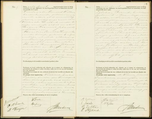 No. 9 Heden acht April negentienhonderd zeven en dertig verschenen voor mij, Ambtenaar van den Burgerlijken Stand van Amsterdam, ten einde een huwelijk aan te gaan: Verstraate, Liendert Willem kantoorbediende, geboren en wo¬ nende alhier, oud eenenveertig arn, meerder aige zoon van Verstiaate, Roeland, zonder be¬ roep, wonende alhier en van Rooijen, Francina Johanna, overleden, en Kesseler, Cornelia Hendrika zonder beroep, geboren te 's. Gra venhage, wonende alhier, oud zesentwintig jaren, meerderja„ rigedochier van: Kesseler, Hendrik Beenaldus Johannes overleden en Kooger, Arna, oud achtenzestig jaren zonder be„ roep, wonende alhier. De moeder der bruid verklaarde mij toestem. ming tot dit huwelijk te geven- De afkondiging tot dit huwelijk is onverhinderd geschied, alhier Bruidegom en bruid verklaarden mij, elkander aan te nemen tot echtgenooten en getrouwelijk alle plichten te zullen vervullen, welke door de wet aan den huwelijken staat zijn verbonden. Daarop heb ik, in naam der wet, verklaard, dat zij door het huwelijk aan elkander zijn verbonden. Als getuigen waren tegenwoordig: Verstraate Jacobus Pieter, broeder des brundegoms handelsagent, oud zeven en veertig jaren, wonende te S-Gra, venhage, en Venhuizen, Luurd Jurriaan, zwager der bruid advocaat en pre cnreur, oud een en veertig jaren, wonende te Hemstede, Waarvan akte, welke overeenkomstig de wet is voorgelezen. No.0 Heden acht April negentienhonderd zeven en dertig verschenen voor mij, Ambtenaar van den Burgerlijken Stand van Amsterdam, ten einde een huwelijk aan te gaan: Zijlstra, Berend, beurtschipper geboren te s. Gravenhage, wonen. de alhier, oud zesentwintig jaren, 0 meerderjarige zoon van: Zijlstra„ Greelt, oud zevenenvijftig jaren, winkelier in Nijhout, Eke, oud negenenvijftig jaren, zonder beroep, beiden wonende te Velsen, in Niederle, Elisabeth, zonder beroep, geboren te Graz m oosten. rijk, wonende alhier, oud vier en twintig jaren, Oostenijksche, meerderjarige dochter van: Kon„ rad, Johann en Belle, Apol¬ lonja, beiden overleden. De ouders des bruidegoms ver klaarden mij toestemming tot dit huwelijk te geven. De afkondiging tot dit huwelijk is onverhinderd geschied, alhier Bruidegom en bruid verklaarden mij, elkander aan te nemen tot echtgenooten en getrouwelijk alle plichten te zullen vervullen, welke door de wet aan den huwelijken staat zijn verbonden. Daarop heb ik, in naam der wet, verklaard, dat zij door het huwelijk aan elkander zijn verbonden. Als getuigen waren tegenwoordig: de Visser Johannes Lambartus, onderwijzer, oud tweeentwintig jaren, wonende te Velsen en Zijlstra, Trijnije, zuster des bruidegoms, zonder beroep, oud vierentwintig ja¬ ren, wonende alhier. Waarvan akte, welke overeenkomstig de wet is voorgelezen. C Verstrade. P H: heisele veyghuien Rooijer WMaalen W B. Zijlstra H: de Voer C: Nredterle T Zijlika C v Zijlrtra JMMaaliewe C Nijhout