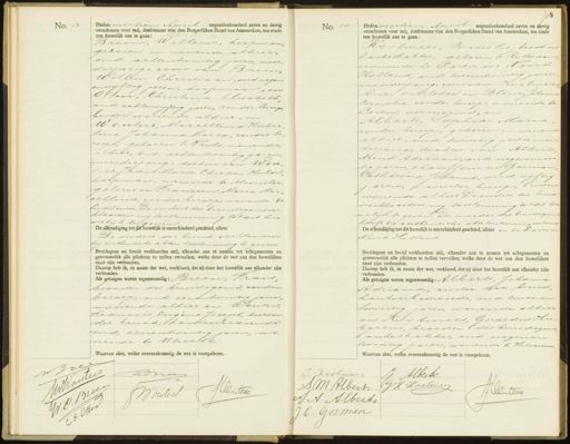 No. 13 Hedenveertien April negentienhonderd zeven en dertig verschenen voor mij, Ambtenaar van den Burgerlijken Stand van Amsterdam, ten einde een huwelijk aan te gaan: Breen, Willem, koopman geboren en wonende alhier, oud achtentwintig jaren, meer¬ derjarige zoon van Breen Willem Christiaan, oud negen envijftig jaren, koopman, en Oen Christina Elisabeth, oud achtenvijftig jaren, zonder beroep beiden wonende alhier, en Wouters, Marcellina Huber tina Johanna Maria, zonder be¬ roep, geboren te Venlo, wonende alhier, oud achtentwintig jaren, meerderjarige dochier van: Won„ ters, Jean Marie Chrétien Hubert koopman, wonende te Munster¬ geleen en Franssen, Maria Mar cellina, zonder beroep, wonende te Eindhoven De ouders des bruidegoms ver klaarden mij toestemming tot dit hu welijk tegeven De afkondiging tot dit huwelijk is onverhinderd geschied, alhier De ouders der bruid verklaarden bij authenticke akten toestemming te geven Bruidegom en bruid verklaarden mij, elkander aan te nemen tot echtgenooten en getrouwelijk alle plichten te zullen vervullen, welke door de wet aan den huwelijken staat zijn verbonden. Daarop heb ik, in naam der wet, verklaard, dat zij door het huwelijk aan elkander zijn verbonden. Als getuigen waren tegenwoordig: Breen Trans broeder des bruidegom, zonder beroep, oud eenentwintig jaren wonende alhier en Wouters, Francois Engene Joseph, broeder der bruid, kantoorbediende oud eenentwintig jaren, wo¬ nende te Utrecht. No. 14 Hedenveertien Apri negentienhonderd zeven en dertig verschenen voor mij, Ambtenaar van den Burgerlijken Stand van Amsterdam, ten einde een huwelijk aan te gaan: Roolmees, Cornelis, brood- en banketbakker, geboren te Rotterdam wonende te Laren in Noord Holland, oud tweeëntwintig jaren meerderjarig zoon van Koolmer trie, overleden en Blom, Johann Cornelia, zonder beroep, wonende te daren, voornoemd in Alberts, Sophia Maria, zonder beroep, geboren en wonende alhier, oud twintig jaren, min dejarige dochter van: Alberts Arend Adriaan, oud negenenveer tig jaren, chauffeur en Gosman, Catharina Johanna, oud vijftig jaren, zonder beroep, beiden wonende alhier. De ouders der bruid verklaarden mij toestemming te dit hu welijk te geven. De moeder des bruidegom heeft bij autheniieke akte toestemming verleend De afkondiging tot dit huwelijk is onverhinderd geschied, alhier en te haren in Noord Holland Bruidegom en bruid verklaarden mij, elkander aan te nemen tot echtgenooten en getrouwelijk alle plichten te zullen vervullen, welke door de wet aan den huwelijken staat zijn verbonden. Daarop heb ik, in naam der wet, verklaard, dat zij door het huwelijk aan elkander zijn verbonden. Als getuigen waren tegenwoordig: Aberts, Johanna Adriana, zuster der bruid, kantoorbediende, oud twee en twintig jaren wonende alhier en Kolmels Guardus Hu„ berius broeder des bruidegom bankelbakker, oud negenen twintig jaren, wonende te Wilversum Waarvan akte, welke overeen Bre Je Bre Ser 7 d JOeitee J Wouters P. B n G 1 C Avolmen J: Alberts. DMM. Albert G J K Hoolmeez J Oesteeg A Alberts J.C. Gosman