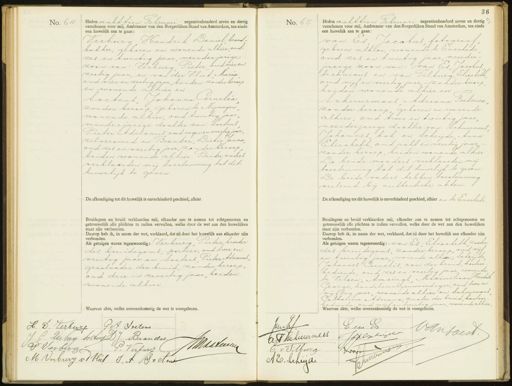 No. 64. Heden achttien Februari negentienhonderd zeven en dertig verschenen voor mij, Ambtenaar van den Burgerlijken Stand van Amsterdam, ten einde een huwelijk aan te gaan: Verburg Hendrik Daniel brood- bakker, geboren en wonende alhier, oud zes en twintig jaar meerderjarige zoon van: Verburg Pieter oud vier en zestig jaar, en van der Vliet Maria oud vier en zestig jaar, beiden zonder beroep en wonende alhier en Soetens, Johanna Cornelia zonder beroep, geboren te Nijwegen wonende alhier oud twintig jaar minderjarige dochter van: soetens Pieter Adrianus oud negen en veertig jaar, zilversmid en Brandse Dirkie Janna oud zes en veertig jaar, zonder beroep beiden wonende alhier. Beider ouders verklaarden mij toestemming tot dit huwelijk te geven. De afkondiging tot dit huwelijk is onverhinderd geschied, alhier. Bruidegom en bruid verklaarden mij, elkander aan te nemen tot echtgenooten en getrouwelijk alle plichten te zullen vervullen, welke door de wet aan den huwelijken Staat. zijn verbonden. Daarop heb ik, in naam der wet, verklaard, dat zij door het huwelijk aan elkander zijn verbonden. Als getuigen waren tegenwoordig: Verburg, Pieter broeder des bruidegoms, portier, oud twee en veertig jaar en Soetens, Pieter Adrianus grootvader der bruid, zonder beroep, oud drie en zeventig jaar, beiden wonende alhier. Waarvan akte, welke overeenkomstig de wet is voorgelezen. No. 65. Heden achttien Februari negentienhonderd zeven en dertig verschenen voor mij, Ambtenaar van den Burgerlijken Stand van Amsterdam, ten einde een huwelijk aan te gaan: van Es Jacobus, folograaf, geboren alhier, wonende te Onschede oud zes en twintig jaar, meerder- jarige zoon van: van 6s, Jacobus technicus en van Tilburg Elisabeth, oud vijf en veertig jaar, - zonder beroep beiden wonende alhier en Schuurmans Adriana Frederica zonder beroep, geboren en wonende alhier, oud twee en twintig jaar meerderjarige dochter van: Schuurmans, Johannes, kok en Scheijde Anna Elisabeth, oud acht en veertig jaar„ zonder beroep, beiden wonende alhier De beide moeders verklaarden mij toestemming tot dit huwelijk te geven De beide vaders hebben toestemming verleend bij authentieke akten. De afkondiging tot dit huwelijk is onverhinderd geschied, alhier en te Enschede, Bruidegom en bruid verklaarden mij, elkander aan te nemen tot echtgenooten en getrouwelijk alle plichten te zullen vervullen, welke door de wet aan den huwelijken staat zijn verbonden. Daarop heb ik, in naam der wet, verklaard, dat zij door het huwelijk aan elkander zijn verbonden. Als getuigen waren tegenwoordig: van Es Elisabeth zuster des bruidegoms, zonder beroep, oud vijf en twintig jaar, wonende alhier; scheijde Johannes Cornelis, oom der bruid, kantoor- bediende, oud zes en veertig jaar, wonende te Velsen; Amsingh Maximiliaan Hendrik george, handelsvertegenwoordiger, oud twee en viftig jaar, wonende alhier en Schuurmans atharina Adriana, zuster der bruid, kantoor. bedvenetedr onnonle de Mn tn notueeaa wonende alhier H. D. Verburg PAt Soetens J. C. Verbug tolten DJ. Brandse P Verberg Verbure JPkatem M Verburg vd Vliet I.A Boeten E. dan Es Jrnt Van toest A J BehuummanJoplslieer f.