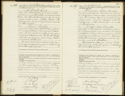 No. 306. Heden negen en twintig September negentienhonderd zeven en dertig verschenen voor mij, Ambtenaar van 'den Burgerlijken Stand van Amsterdam, ten einde een huwelijk aan te gaan: van Emrik, Levie oud twee entwintig jaren, rijnrelhersteller, geboren en wonende alhier, meerderjarige zoon Avan van Emrik, Samson, oud vier enzestig jaren, renter en van: Nebig, Aaltje, oud zestig jaren, zonder beroep, beiden wonende te Amsterdam, en — Pront, Rachel, oud twintig jaren, zonder beroep, geboren en wonende alhier, minderjarige dochter van Pront, Jacob, oudvijf enveertig jaren magazijnbediende en van: de Hond, Aaltje, oud vier enveertig jaren, zonder beroep, beiden wonende te Amsterdam. De ouders vanbruidegem enbruid, hierbij tegen„ woordig, verklaarden mij hunne toestemming tot dit huwelijk tegeven.- De afkondiging tot dit huwelijk is onverhinderd geschied, alhier . Bruidegom en bruid verklaarden mij, elkander aan te nemen tot echtgenooten en getrouwelijk alle plichten te zullen vervullen, welke door de wet aan den huwelijken staat zijn verbonden. Daarop heb ik, in naam der wet, verklaard, dat zij door het huwelijk aan elkander zijn verbonden. Als getuigen waren tegenwoordig: Neb19, Mozes, oom van denbuidegem, koopman, oud drie enzeventig jaren en Groen, Willem Zwagerderbund, koopman, oudacht endertig jaren, beiden wonende te Amsterdam. Waarvan akte, welke overeenkomstig de wet is voorgelezen. No. 307 ƒW.4 Heden dertig September negentienhonderd zeven en dertig verschenen voor mij, Ambtenaar van den Burgerlijken Stand van Amsterdam, ten einde een huwelijk aan te gaan: Hursman, Siebren Cornelis, oud vier entwintig jaren, tasci-ondememer, geboren te Rotterdam, wonende alhier, meerderjarige zoon van Huisman, Laurens, oudvijf enzestig jaren en van: de Jong, Siebrigje, oudeen en zestig jaren, beiden zonder beroep en wonende te Amsterdam, en — Verseel, Alida Petronella, oud drie entwintig jaren, zonder beroep, geboren te Watergraafsmeer, wonende alhier, meerderjarige dochter van Verseef, Hermanus Jacobus oud een envijftig jaren, koopman en van: van Kooperen Petronella, oud eenen vijftig jaren, zonder beroep, beiden wonende te Amsterdam. De ouders van bruidegom onbruid, mierby tegenwoordig, verklaarden mij hunne toestemming tot dit huwelijk te geven. De afkondiging tot dit huwelijk is onverhinderd geschied, alhier, Bruidegom en bruid verklaarden mij, elkander aan te nemen tot echtgenooten en getrouwelijk alle plichten te zullen vervullen, welke door de wet aan den huwelijken staat zijn verbonden. Daarop heb ik, in naam der wet, verklaard, dat zij door het huwelijk aan elkander zijn verbonden. Als getuigen waren tegenwoordig: Verseef, Maria, zuster derbruid, zonder beroep oudvier entwintig jaren, wonende te Gormeter en Huisman, Catharina, zuster van den bruidegem, zonder beroep, oudzeven endertig jaren, wonende te voorburg. B Melia J: Gront 1 Gv Em A. de Hond ASietie R. Pront W. Groeh I. v. Enrik D JJ 1 A W Weeee