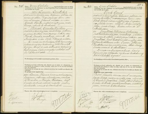 No. 314. Heden Zeven October negentienhonderd zeven en dertig verschenen voor mij, Ambtenaar van den Burgerlijken Stand van Amsterdam, ten einde een huwelijk aan te gaan: van Leeuwen, Lambertus, oud acht en twintig jaren, koopman, geboren en wonende alhier, meerderjarige zoon van van Leeuwen, Johannes, overleden en van Sjoerds, Stijntje, ond twee envijftig jaren, zonder beroep, wonende te Amsterdam, en Borsch, Cornelia Christina, oudzes en twintig jaren, zonder beroep, geboren en wonende alhier, meerderjarige dochter van Borch, Cornelis, zonder beroep, wonende te Amsterdam en van: Vork, Willemijntje, overleden. De moeder van denbnidegom, hierbij tegenwoordig verklaarde mij hare toestemming tot dit huwelijk te geven, terwijl de vader derbruid die toestemming heeft gegeven, blijkens overgelegd uittreksel uit een authentieke akte. De afkondiging tot dit huwelijk is onverhinderd geschied, alhier. Bruidegom en bruid verklaarden mij, elkander aan te nemen tot echtgenooten en getrouwelijk alle plichten te zullen vervullen, welke door de wet aan den huwelijken staat zijn verbonden. Daarop heb ik, in naam der wet, verklaard, dat zij door het huwelijk aan elkander zijn verbonden. Als getuigen waren tegenwoordig: van Leeuwen, Johannes, broeder van den brudegom koopman, oud negen entwintig jaren, wonende te Haarlem en Faassen, Gristiaan, half„ broeder derbruid, oudacht endertig jaren, bankwerker, wonende te Amsterdam. Waarv. No. 315. JJD:P Heden Zeven October negentienhonderd zeven en dertig verschenen voor mij, Ambtenaar van den Burgerlijken Stand van Amsterdam, ten einde een huwelijk aan te gaan: Vink, Gerrit. oudzes entwintig jaren, techniars, geboren en wonende alhier, meerderjarige zoon van Vink, Gerrit, oudvier envijftig jaren, bngadier van politie en van: Nuyjen, Antje, oudvijftig jaren, zonder beroep, beiden wonende te Amsterdam, en Jongbloed, Wilhelmina Catharina, oud zes entwintig jaren, zonder beroep, geboren en wonende alhier, meerderjarige dochter van Jongbloed, Jacob Kerdolf, oud acht envijftig jaren gemeente ambtenaar en van: Cremer, Johanna Hendrika, oud drie enzestig jaren, zonder beroep, beiden wonende te Amsterdam. De ouders vanbruidegom inbruid, hierbij tegenwoordig, verklaarden mij hunne toestemming tot dit huwelijk tegeven De afkondiging tot dit huwelijk is onverhinderd geschied, alhier , - Bruidegom en bruid verklaarden mij, elkander aan te nemen tot echtgenooten en getrouwelijk alle plichten te zullen vervullen, welke door de wet aan den huwelijken staat zijn verbonden. Daarop heb ik, in naam der wet, verklaard, dat zij door het huwelijk aan elkander zijn verbonden. Alsgetuigen waren tegenwoordig: Boot, Cornelis, oom van den bruidegom, zonder beroep, oudeen enzestig jaren wonende te eek en Jongbloed, Johan Albert Lodewijk broeder derbmuid, gemeente ambtenaar, ond dertig jaren, wonende te Amsterdam. Waarvan akte, welke overeenkomstig de wet is voorgelezen.
