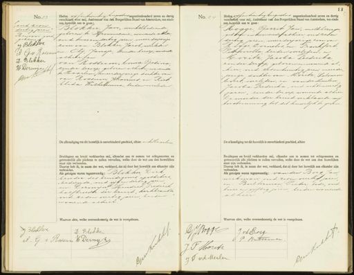 No.23 „oud zesen dertig jaren Renvooi goed. gekeur. J Blokker A: G v Rossun D. Blokken do teto H Dermyn en 1 Heden vyfentwintig Bugustus negentienhonderd zeven en dertig verschenen voor mij, Ambtenaar van den Burgerlijken Stand van Amsterdam, ten einde een huwelijk aan te gaan; geboren te Krommenie, wonende alhier, Blokker, Jan, winkelbediende oud twee en dertig jaren meerderjarige zoon van: Blokker, Jacob, overleden en: Olij, Jansje, zonder beroep, wonende alhier, en van Rossum, Anna Gesina zonder beroep, geboren alhier, wonende te Haarlem, meerderjarige dochter van van Rossum Johannes en: Riet Alida Wilhelmina, beiden overleden De afkondiging tot dit huwelijk is onverhinderd geschied, alhier en te Haarlem Bruidegom en bruid verklaarden mij, elkander aan te nemen tot echtgenooten en getrouwelijk alle plichten te zullen vervullen, welke door de wet aan den huwelijken Staat zijn verbonden. Daarop heb ik, in naam der wet, verklaard, dat zij door het huwelijk aan elkander zijn verbonden. dds getuigen waren tegenwoordig: Blokker Dirk broeder des bruidegoms opothekers „bediende, oud vijf en dertig jaren en: Dermijn Hendrik Frederik holfbroeder der bruid, kerkbeambte oud zesen veertig jaren, beiden wonende alhier Waarvan akte, welke overeenkomstig de wet is voorgelezen. No. 24 Heden vijf en twintig Bugustus negentienhonderd zeven en dertg verschehen voor mij, Ambtenaar van den Burgerlijken Stand van Amsterdam, ten einde een huwelijk aan te gaan: Hogge, Gerrit Jan, melkbezorger geboren en wonende alhier oud zes en dertig jaren, meerderjarige zoon van Hogge Cornelis, en: Frankfort Petronella beiden overleden; en Mortz Jacoba Frederika zonder beroep, geboren en wonende alhier oud zes en twintig jaren meerder, „jarige dochter van: Moretz Salomon Evert, overleden, en: van der Meulen Jacoba Frederika, oud achtenveertig jaren, zonder beroep, wonende alhier De moeder der bruid verklaarde mi toestemming tot dit huwelijk te geven De afkondiging tot dit huwelijk is onverhinderd geschied, alhier Bruidegom en bruid verklaarden mij, elkander aan te nemen tot echtgenooten en getrouwelijk alle plichten te zullen vervullen, welke door de wet aan den huwelijken staat zijn verbonden. Daarop heb ik, in naam der wet, verklaard, dat zij door het huwelijk aan elkander zijn verbonden. Als getuigen waren tegenwoordig: van den Borg Jan werkman oud zes en veertig jaren, en: Bulterman, Pieter bode, oud twee en vyftig jaren beiden wonende alhier. Waarvan akte, welke overeenkomstig de wet is voorgelezen. Blokker D. Blokker A. G v Rossan W Derwyk JJrgge J v.d. Boeg P: Bulterman. J J Hortz J J va Meulen