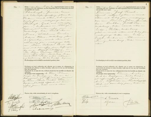 No. 13 Heden negentien Augustus negentienhonderd zeven en dertig verschenen voor mij, Ambtenaar van den Burgerlijken Stand van Amsterdam, ten einde een huwelijk aan te gaan: Stratingh, Jannes leeraar in de lichamelijke opvoeding, geboren te Veendam, wonende alhier oud negenentwintig jaren, meerderjarige zoon van Stratingh, Geert, oud achtenvijftig jaren —, bankdirecteur en Ibelings; Godina, oud achtenvyftig jaren zonder beroep, beiden wonende alhier en Kroes, Wilhelmina Cornelia Antonia Helena, zonder beroep, geboren te 's Gravenhage, wonende alhier, oud achtentwintig jaren, meerderjarige dochter van: Kroes, Richardus Cornelis Adrianus, oud zesenvyftig jaren, hoofdingpec teur van een Aelegraafmaatschappij enVos, Helena Francisca Clasina, oud drieen vyftig Jaren, zonder beroep, beiden wonende alhier. Beider ouders verklaarden mij toestemming tot dit huwelijk te geven De afkondiging tot dit huwelijk is onverhinderd geschied, alhier Bruidegom en bruid verklaarden mij, elkander aan te nemen tot echtgenooten en getrouwelijk alle plichten te zullen vervullen, welke door de wet aan den huwelijken staat zijn verbonden. Daarop heb ik, in naam der wet, verklaard, dat zij door het huwelijk aan elkander zijn verbonden. Als getuigen waren tegenwoordig: de Vries Klaas, zwager des bruidegoms, lid van den Onderwijsraad oud vifenzeventig jaren en de Haan, Charles Everhard Willem, kapitein, plaatselijk adjudant, oud drieënvijftig jaren, beiden wonende alhier. Waarvan akte, welke overeenkomstig de wet is voorgelez No. 14 Heden negentien Augustusnegentienhonderd zeven en dertig verschenen vóor mij, Ambtenaar van den Burgerlijken Stand van Amsterdam, ten einde een huwelijk aan te gaan: Dinner, Josef Hersch, adjunct - robbijn, geboren en wonende alhier, oud dertig jaren, meerderjarige zoon van Dinner, Elias, administra teur en Drukker, Judith Lea, zonder beroep, beiden wonende alhier en Eitje, Hilde, zonder beroep geboren en wonende alhier, oud dertig jaren meerderjarige dochter van: Eitje Zadok bankier en Altmann, Janny, zonder beroep, beiden wonende alhier. De afkondiging tot dit huwelijk is onverhinderd geschied, alhier Bruidegom en bruid verklaarden mij, elkander aan te nemen tot echtgenooten er getrouwelijk alle plichten te zullen vervullen, welke door de wet aan den huwelijken staat zijn verbonden. Daarop heb ik, in naam der wet, verklaard, dat zij door het huwelijk aan elkander zijn verbonden. Als getuigen waren tegenwoordig: Linner, Amalia tante des bruidegoms zonder beroep, oud vijfenvyftig jaren en Gazan. Anna, hoofdleidster van Mlaatschappelijk Werk, oud zevenendertig jaren, beiden wo nende alhier gutzen. WMliyk JM D Vrde H H C Vos Ded SMaalien N WWtttingh. e Acte G Ibelugs HDinned A: Vinner A.Jazen Writje J: Olerteeg
