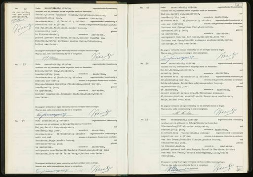 No. 51 de doorhaling van een woor- goedgekeurd. AJJM Wohe 8 Heden zesentwintig oktober negentienhonderd tweeënzestig verscheen voor mij, ambtenaar van de burgerlijke stand van Amsterdam: Wendels, Pieter Johannes Josinus,begrafenisondernemer, oud negenenvijftig jaar, wonende te Amsterdam, die verklaarde, dat op vijfentwintig oktober negentienhonderd tweeënzestig t zeventien uur vijftien minuten, in de gemeente Amsterdam is overleden van Puijfelik,Wilhelmina,zonder beroep, oum zesenzestig jaar, geboren te Nieuwer-Amstel, wonende te Amsterdam, gehuwd geweest met: Harms,Antonie,dochter van: Pan van Puijfelik, Petrus Adrianus en: van Welie,Wilhelmina, beiden overleden. De aangever verklaarde uit eigen wetenschap van het overlijden kennis te dragen Waarvan akte, welke overeenkomstig de wet is voorgelezen. Haantje GJ JM No. 55 Heden zesentwintig oktober negentienhonderd tweeënzestig verscheen voor mij, ambtenaar van de burgerlijke stand van Amsterdam: Meijer, Gerrit Jan,aanspreker, oud tweeënvijftig jaar, wonende te Amsterdam, die verklaarde, dat op vijfentwintig oktober negentienhonderd tweeënzestig te een uur vijftien minuten, in de gemeente Amsterdam is overleden Pootman van Oyen, Johan Paul,bankwerker, oud zevenenvijftig jaar, geboren te Amsterdam, wonende te Amsterdam, echtgenoot van: van der Zeeuw,Elisabeth,zoon van: Pootman van Oyen, Hendrik Johannes en: Boxstardt, Bertha Catharina,beiden overleden. De aangever verklaarde uit eigen wetenschap van het overlijden kennis te dragen. Waarvan akte, welke overeenkomstig de wet is voorgelezen. Baant C messen No. 53 Heden zesentwintig oktober negentienhonderd tweeënzestig, verscheen voor mij, ambtenaar van de burgerlijke stand van Amsterdam: Meijer, Gerrit Jan,aanspeeker, oud tweeënvijftig jaar, wonende te Amsterdam, die verklaarde, dat op vijfentwintig oktober negentienhonderd tweeënzestig te zestien uur dertig minuten, in de gemeente Amsterdam is overleden Riepen, Johanna Hendrika Philippina,zonder beroep, oud geboren tweeënzestig jaar, te Amsterdam, wonende te Amsterdam, dochter van: Riepen, Johannes en: Klein,Saakje,beiden overleden. De aangever verklaarde uit eigen wetenschap van het overlijden kennis te dragen. Waarvan akte, welke overeenkomstig de wet is voorgelezen. Brantg Gmeyen No. 56 Heden zesentwintig oktober negentienhonderd tweeënzestig verscheen voor mij, ambtenaar van de burgerlijke stand van Amsterdam: Mulder, Herman,aanspreker, oud zeventig jaar, wonende te Amsterdam, die verklaarde, dat op vierentwintig oktober negentienhonderd tweeënzestig t drieentwintig uur nul minuten, in de gemeente Amsterdam is overleden Solleveld, Anna Catharina Adriana,zonder beroep, oum geboren negenenzeventig jaar, te Amsterdam, wonende te Amsterdam, gehuwd geweest met: de Graaff,Wilhelmus Johannes Alphonsus,dochter van: Solleveld, Franciscus en: Huneker, Antje,beiden overleden. De aangever verklaarde uit eigen wetenschap van het overlijden kennis te dragen. Waarvan akte, welke overeenkomstig de wet is voorgelezen. Waants H. Mulder. No. 54 Heden zesentwintig oktober negentienhonderd tweeënzestig verscheen voor mij, ambtenaar van de burgerlijke stand van Amsterdam: Meijer, Gerrit Jan,aanspreker, oud tweeënvijftig jaar, wonende te Amsterdam, die verklaarde, dat op vierentwintig oktober negentienhonderd tweeënzestig te acht uur nul minuten, in de gemeente Amsterdam is overleden Bouthoorn,Aagje,zonder beroep, oud zevenenzeventig jaar, geboren te Amsterdam, wonende te Amsterdam, echtgenote van: Ehrhardt, Hendrik Franciscus,dochter van: Bouthoorn, Dirk en: de Vries,Margje,beiden overleden. De aangever verklaarde uit eigen wetenschap van het overlijden kennis te dragen. Waarvan akte, welke overeenkomstig de wet is voorgelezen. Baansp Smeyeny No. 57 Heden zesentwintig oktober negentienhonderd tweeënzestig verscheen voor mij, ambtenaar van de burgerlijke stand van Amsterdam: Bleekemolen,Willebrordus,aanspreker, oud eenenvijftig jaar, wonende te Amsterdam, die verklaarde, dat op vijfentwintig oktober negentienhonderd tweeënzestig te negentien uur vijftien minuten, in de gemeente Amsterdam is overleden: van der Zwaan, Cornelia Clasina,zonder beroep, oud eenenzeventig jaar, geboren te Nieuwer-Amstel, wonende te Amsterdam, gehuwd geweest met:van Langen, Cornelis Martinus,dochter van: van der Zwaan, Jacobus en: Bergkamp, Alida,beiden overleden. De aangever verklaarde uit eigen wetenschap van het overlijden kennis te dragen. Waarvan akte, welke overeenkomstig de wet is voorgelezen. Haarz WKlemen