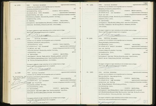 Brandse, Leendert,aanspreker, zevenendertig jaar, wonende te Auder-Amstel, die verklaarde, dat op elf december negentienhonderd tweeënzestig t vijf uur nul minuten, in de gemeente Amsterdam is overleden Christiaanse, Johan Frederik,broodbakker, oud geboren eenenvijftig jaar, wonende te Amsterdam, te Amsterdam, echtgenoot van:Nickel, Erna,zoon van: Christiaanse, Jacobus Johannes en: Droog,Maria Susanna,beiden overleden. De aangever verklaarde uit eigen wetenschap van het overlijden kennis te dragen. Waarvan akte, welke overeenkomstig de wet is voorgelezen. N D Brancs No. 1079. Heden dertien december negentienhonderd tweeënzestig verscheen voor mij, ambtenaar van de burgerlijke stand van Amsterdam: Brandse, Leendert,aanspreker, oud zevenendertig jaar, wonende te Ouder-Amstel, die verklaarde, dat op elf decembef negentienhonderd tweeënzestig t vijftien uur nul minuten, in de gemeente Amsterdam is overleden Out Joustra, Pieter Frederik,zonder beroep, geboren A eenenzestig jaar, te Amsterdam, wonende te Amsterdam, echtgenoot van:de Wagt,Antje Rinske,gehuwd geweest met: Dekker, Barendina,zoon van: Joustra, Lourens en: de Vries, Catharina,beiden overleden. De aangever verklaarde uit eigen wetenschap van het overlijden kennis te dragen. Waarvan akte, welke overeenkomstig de wet is voorgelezen. I Brands No. 1082. Heden dertien december negentienhonderd tweeënzestig verscheen voor mij, ambtenaar van de burgerlijke stand van Amsterdam: Waas, Salomon,inkasseerder, oud drieenzestig jaar, wonende te Amsterdam, die verklaarde, dat op twaalf december negentienhonderd tweeënzestig t zes uur dertig minuten, in de gemeente Amsterdam is overleden Lisser, Gompert,zonder beroep, oud zevenenzestig jaar, geboren te Amsterdam, wonende te Amsterdam, echtgenoot van: van Thijn,Sippora,zoon van: Lisser, David en: de Hond, Rosa,beiden overleden. De aangever verklaarde uit eigen wetenschap van het overlijden kennis te dragen. Waarvan akte, weke overeenkomstig de wet is voorgelezen. 8 17 1 No. 1080. de doorhaling van een woord goed- gekeurd. Brant Nooa Heden dertien december negentienhonderd tweeënzestig verscheen voor mij, ambtenaar van de burgerlijke stand van Amsterdam: Brandse, Leendert,aanspreker, oud zevenendertig jaar, wonende te Ouder-Amstel,. die verklaarde, dat op elf december negentienhonderd tweeënzestig te negen uur vijftien minuten, in de gemeente Amsterdam is overleden o Bos, Heike,zonder beroep, geboren vierenzeventig jaar, wonende te Amsterdam. te Slochteren, echtgenote van: Smit, Jan Jan Jacob,dochter van: Bos, Hendrik en: Pruisman,Anna,beiden overleden. De aangever verklaarde uit eigen wetenschap van het overlijden kennis te dragen. Waarvan akte, welke overeenkomstig de wet is voorgelezen. B Brandt No. 1083 Heden dertien dedember negentienhonderd tweeënzestig verscheen voor mij, ambtenaar van de burgerlijke stand van Amsterdam: Meijer, Gerrit Jan,aanspreker, oud tweeënvijftig jaar, wonende te Amsterdam, die verklaarde, dat op elf december negentienhonderd tweeënzestig te zeventien uur dertig minuten, in de gemeente Amsterdam is overleden van Rijn, Johannes Nicolaas,portier, oud vierenzestig jaar, geboren te Raamsdonk, wonende te Amsterdam, echtgenoot van: Brans, Maria Anna Antonia,gehuwd geweest met: Bosdriesz, Margaretha Maria,zoon van: van Rijn,Nicolaas en: Joore,Maria Johanna,beiden overleden. De aangever verklaarde uit eigen wetenschap van het overlijden kennis te dragen. Waarvan akte, welke overeenkomstig de wet is voorgelezen. Omeyens