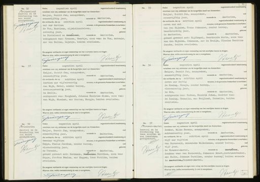 No. 52 Prinsenland Renvooi en de doorhaling van een woord goedgekeurd. Brepen 75 Jaan Heden negentien april negentienhonderd tweeënzestig verscheen voor mij, ambtenaar van de burgerlijke stand van Amsterdam: Meijer, Gerrit Jan, aanspreker, oud eenenvijftig jaar, wonende te Amsterdam, nul uur dertien minuten, in de gemeente Amsterdam is overleden die verklaarde, dat op achttien april negentienhonderd tweeënzestig te de Vos, Bastiaan, rijwielhandelaar, oud zeventig jaar, geboren te Dinteloord en Prinsland, wonende te Amsterdam, echtgenoot van: Franzen, Geertje, zoon van: de Vos, Antonie, en: van Helden, Lijntje, beiden overleden. De aangever verklaarde uit eigen wetenschap van het overlijden kennis te dragen. Waarvan akte, welke overeenkomstig de wet is voorgelezen. Hrantj Cmer No. 55 Heden negentien april negentienhonderd tweeënzestig verscheen voor mij, ambtenaar van de burgerlijke stand van Amsterdam: Meijer, Gerrit Jan, aanspreker, oud eenenvijftig jaar, wonende te Amsterdam, die verklaarde, dat op achttien april negentienhonderd tweeënzestig t zeven uur nul minuten, in de gemeente Amsterdam is overleden van den Eijnden, Frans Johannes, zonder beroep, oud geboren tweeëntachtig jaar, te Amsterdam, wonende te Amsterdam, gehuwd geweest met: Rijfkogel, Geertruida Maria, zoon van: van den Eijnden, Johannes, en: de Bruijn, Clasina Hendrina Jacoba, beiden overleden. De aangever verklaarde uit eigen wetenschap van het overlijden kennis te dragen. Waarvan akte, welke overeenkomstig de wet is voorgelezen. Jransp Zuspens No. 53 Heden negentien april negentienhonderd tweeënzestig verscheen voor mij, ambtenaar van de burgerlijke stand van Amsterdam: Meijer, Gerrit Jan, aanspreker, ou eenenvijftig jaar, wonende te Amsterdam, die verklaarde, dat op achttien april negentienhonderd tweeënzestig t dertien uur vijfenveertig minuten, in de gemeente Amsterdam is overleden van Wijk, Peter, zonder beroep, oud geboren zevenenzeventig jaar, wonende te Amsterdam, te Zwolle, echtgenoot van: Hooghoed, Johanna Hendrika Elske, zoon van: van Wijk, Wiecher, en: Oosten, Margje, beiden overleden. De aangever verklaarde uit eigen wetenschap van het overlijden kennis te dragen. Waarvan akte, welke overeenkomstig de wet is voorgelezen. Baart prieyjer No. 56 Heden negentien april negentienhonderd tweeënzestig verscheen voor mij, ambtenaar van de burgerlijke stand van Amsterdam: Meijer, Gerrit Jan, aanspreker, oud eenenvijftig jaar, wonende te Amsterdam, die verklaarde, dat op achttien april negentienhonderd tweeënzestig te zeven uur dertig minuten, in de gemeente Amsterdam is overleden de Koning, Niesje, zonder beroep, oud vierenzestig jaar, geboren